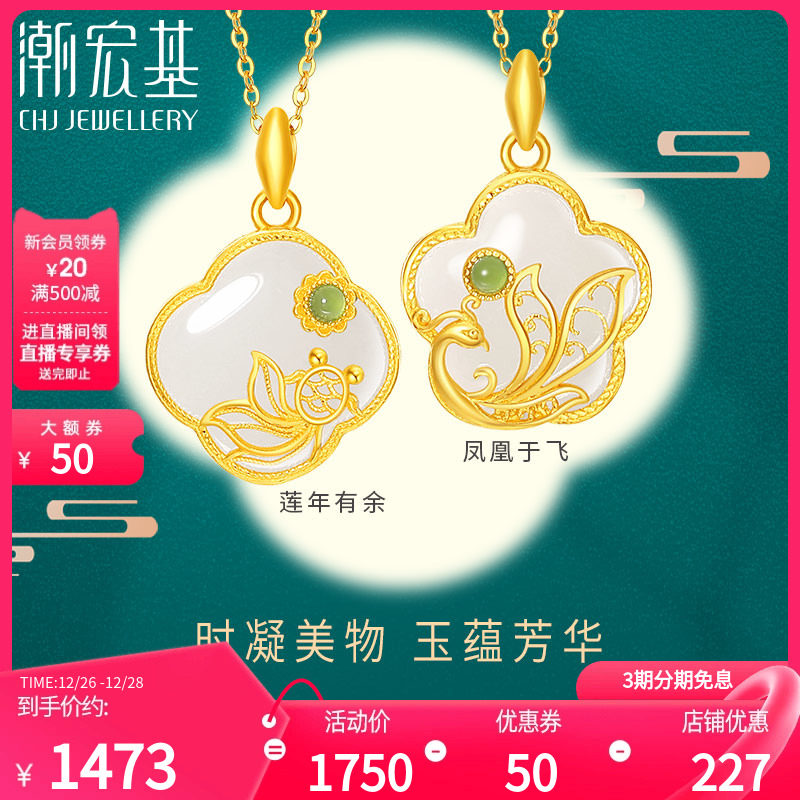 潮宏基 富贵花开 和田玉黄金项链吊坠金镶玉女款足金