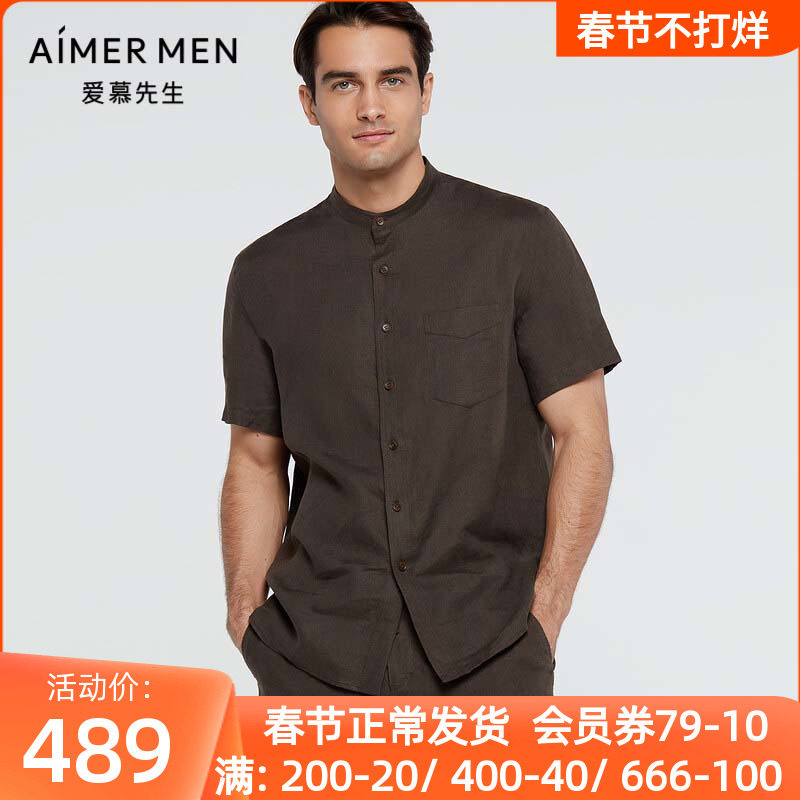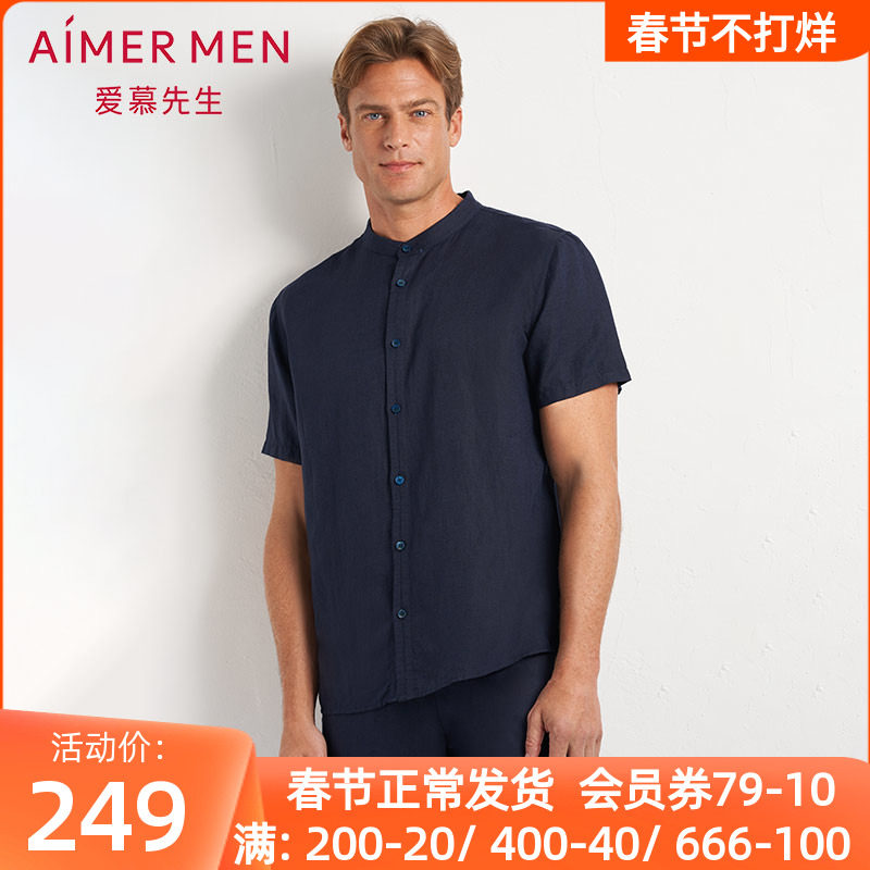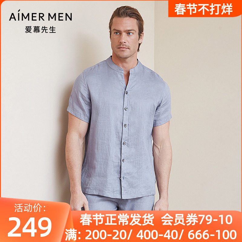 爱慕先生正品薄款亚麻立领开衫男士春夏家居外穿短袖上衣NS81E641