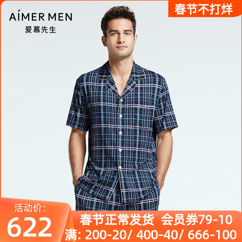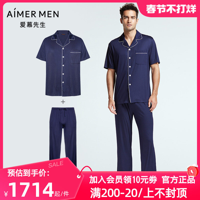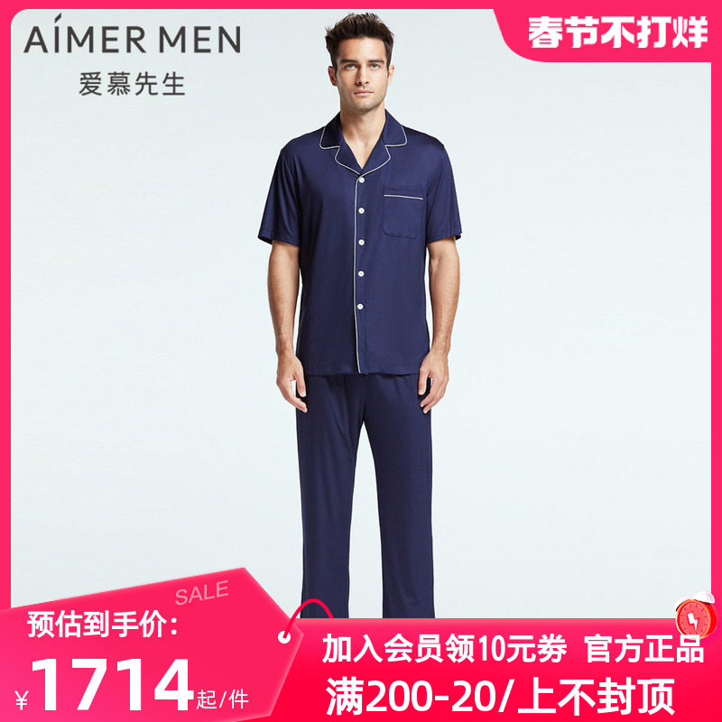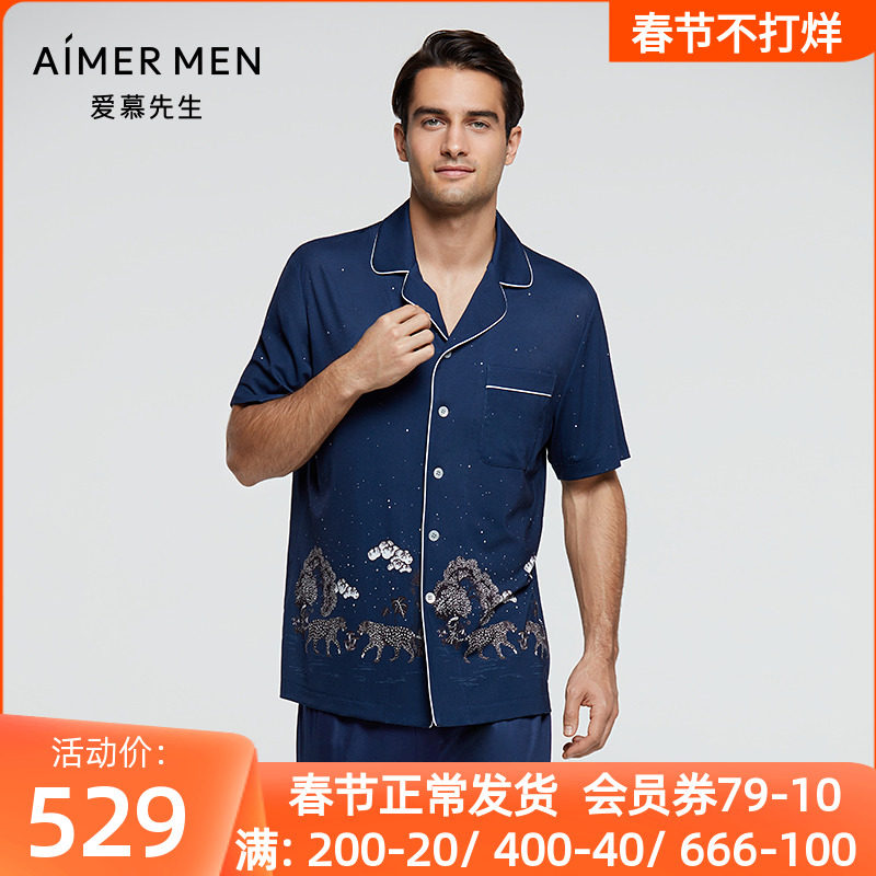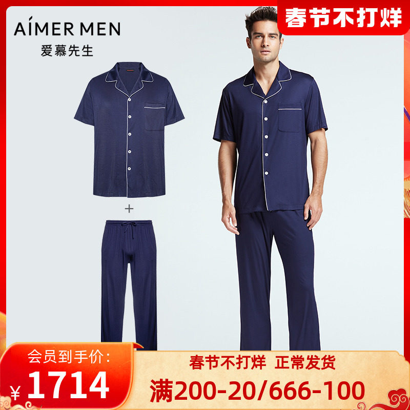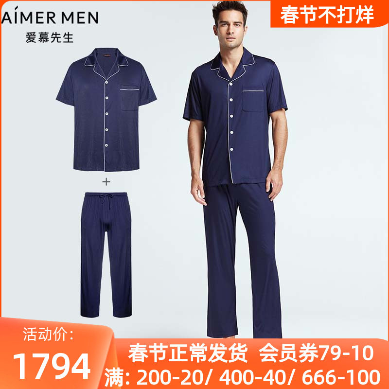 爱慕先生春夏亲肤莫代尔翻领开衫短袖上衣长裤男士家居服睡衣套装