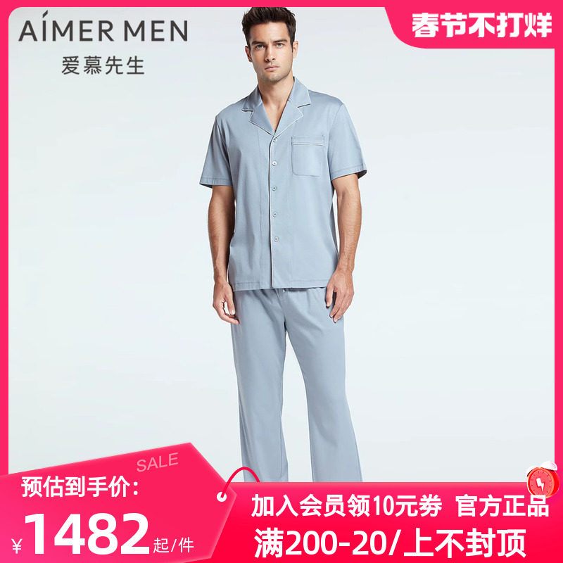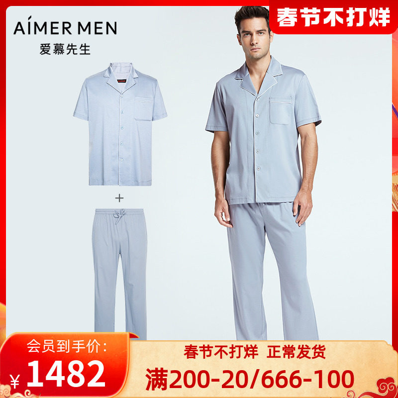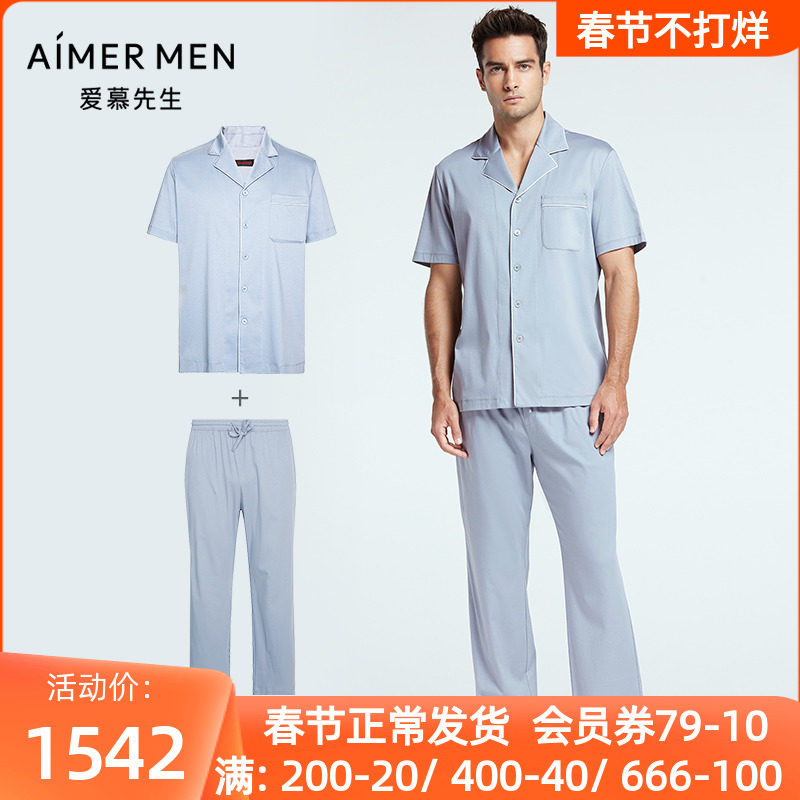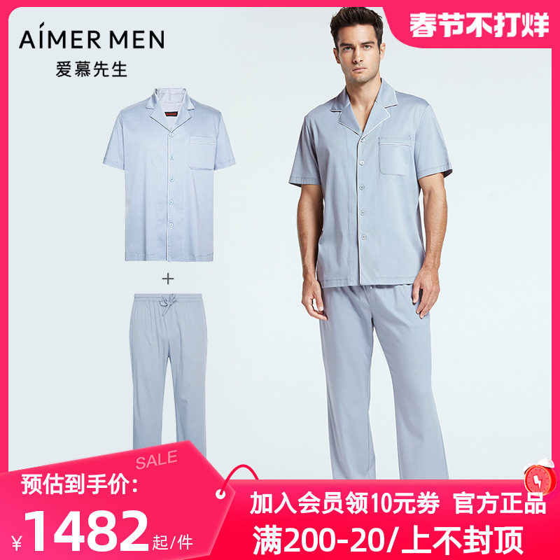 爱慕先生春夏100%纯棉翻领开衫短袖+长裤舒适男士家居服睡衣套装