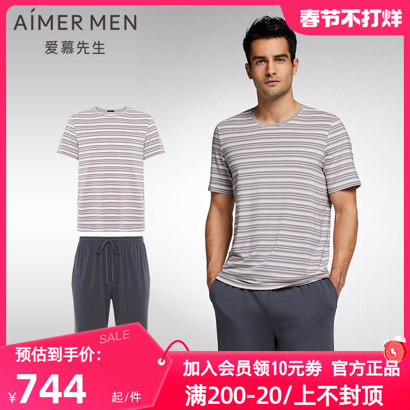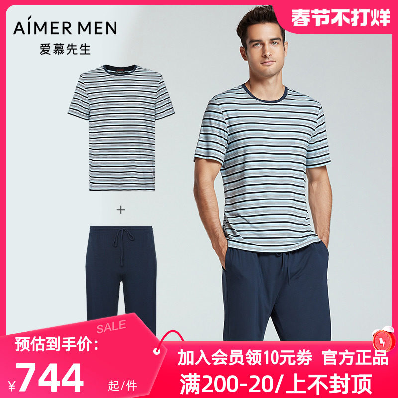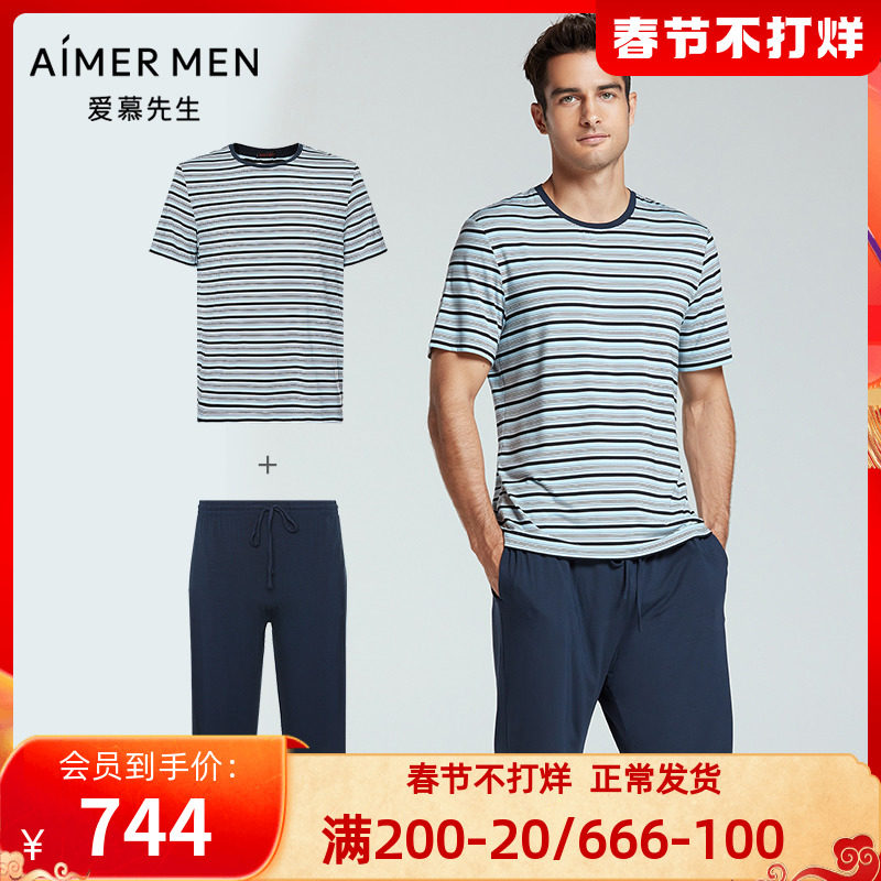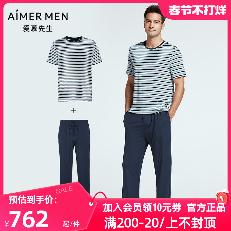 爱慕先生春夏条纹莫代尔亲肤圆领短袖T恤长裤男士家居服睡衣套装