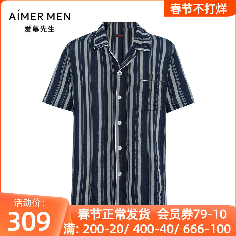 爱慕先生官方正品男士款短袖褶皱棉家居服睡衣条纹上衣 NS41E361