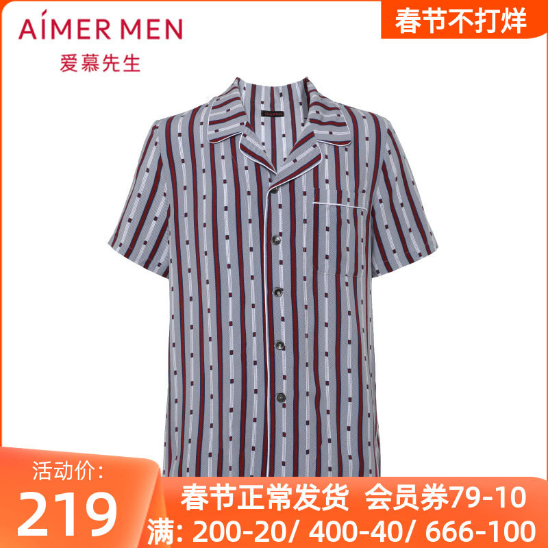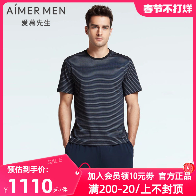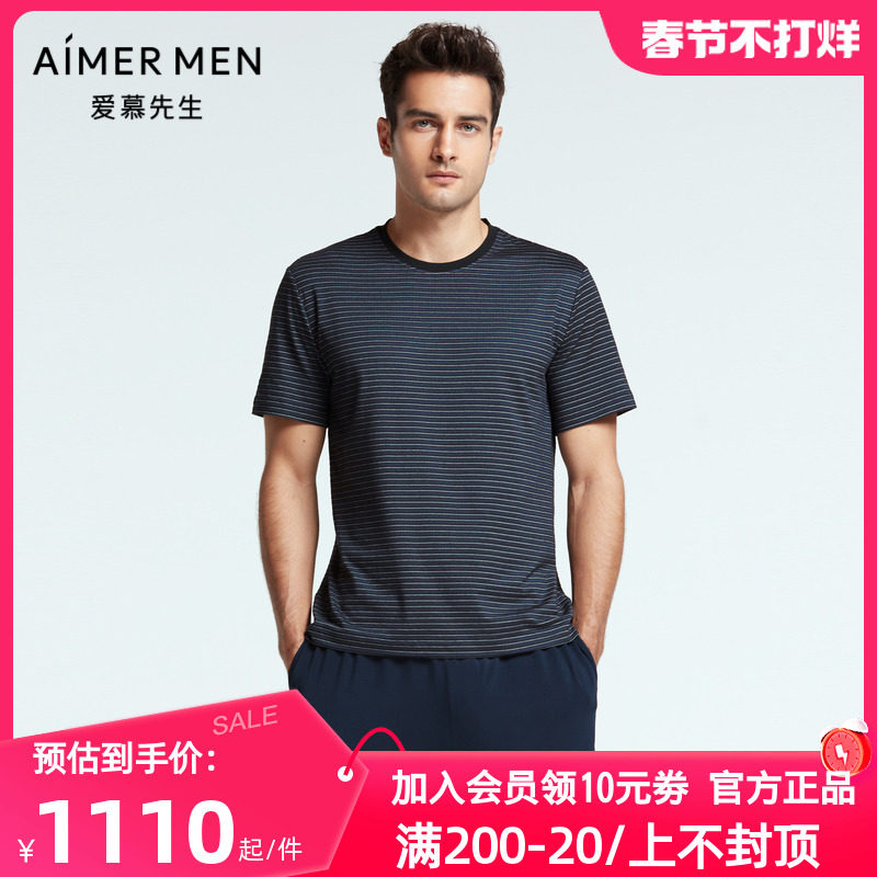 爱慕先生官方专柜正品上衣 男士款条纹印花套头家居短袖NS41D821