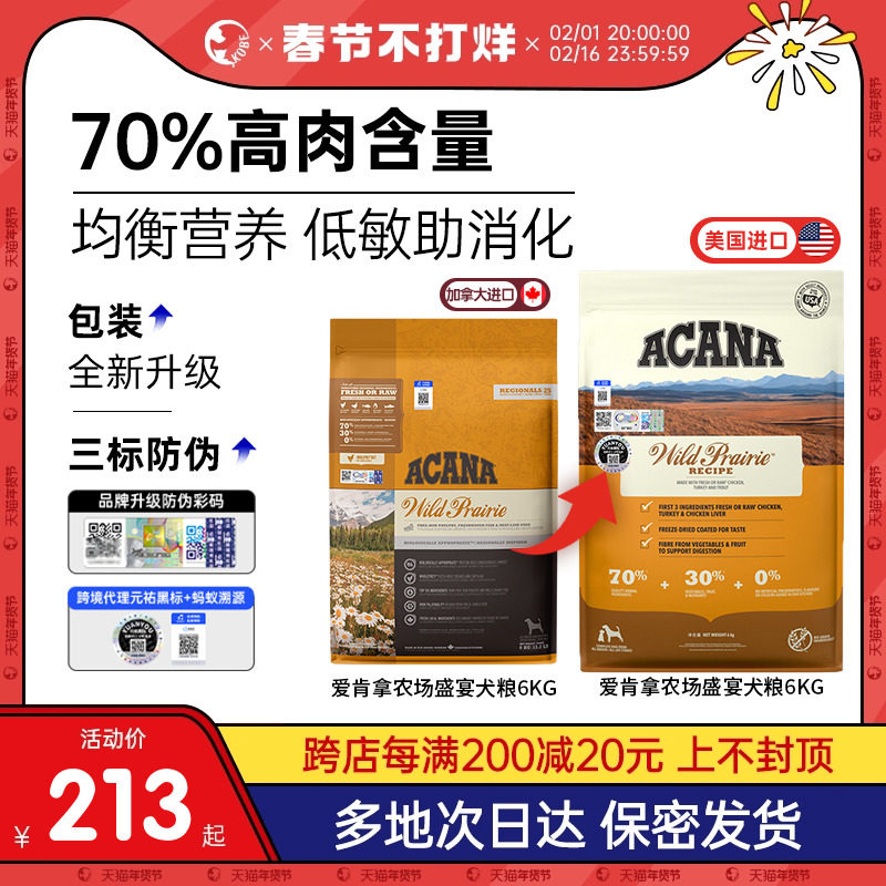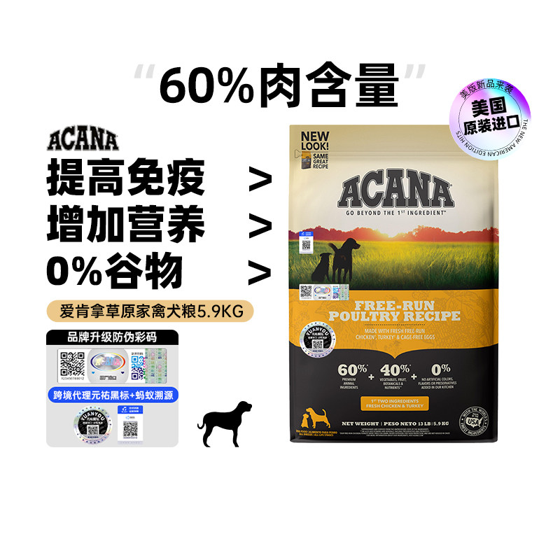 美版ACANA爱肯拿草原家禽配方犬粮通用型成犬幼犬狗粮无谷5.9KG
