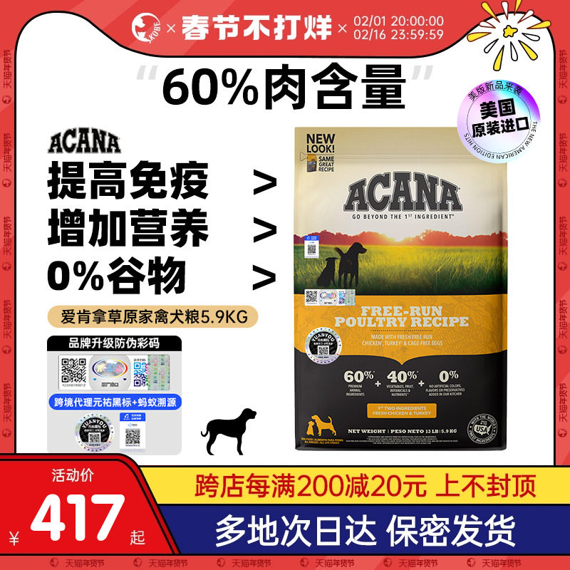 美版ACANA爱肯拿草原家禽配方犬粮通用型成犬幼犬无谷狗粮5.9KG