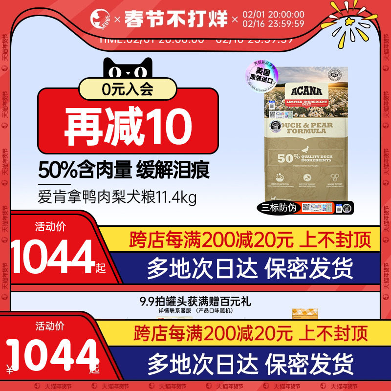 爱肯拿正品防伪11.4kg6kg鸭肉梨牧场盛宴成犬幼犬粮无谷进口狗粮