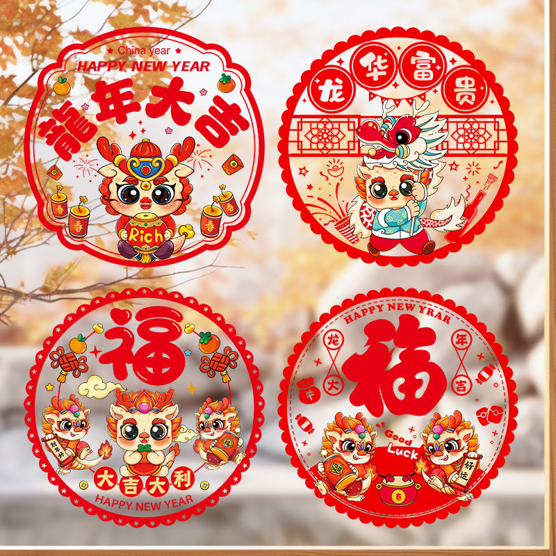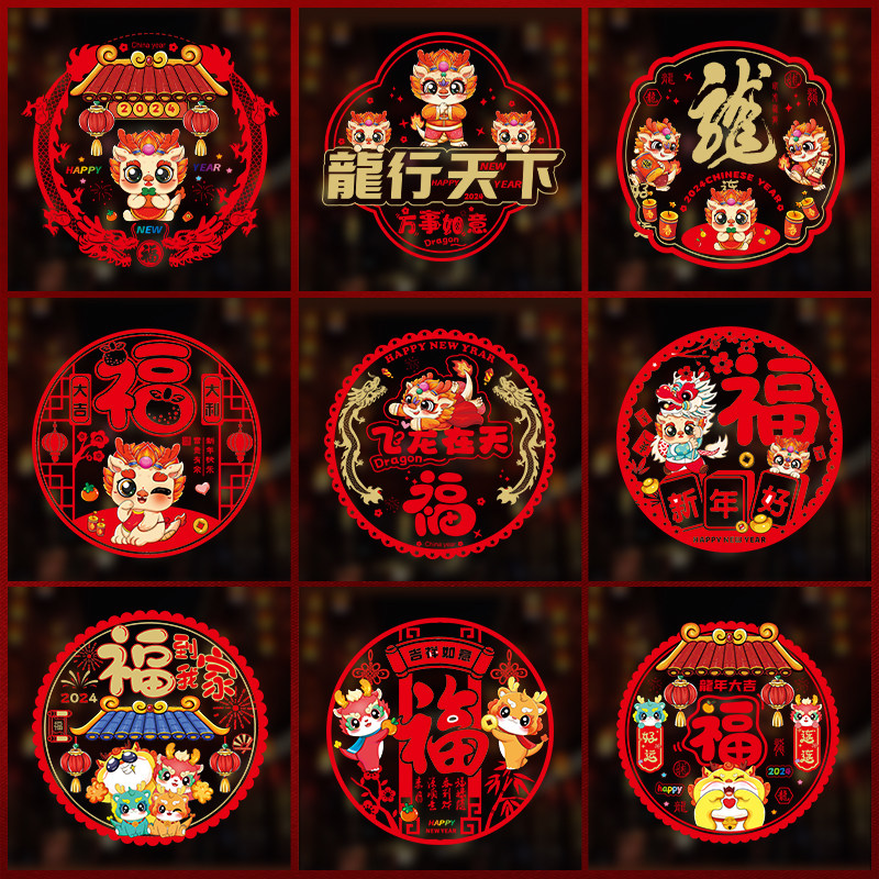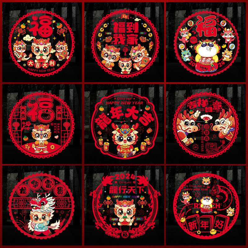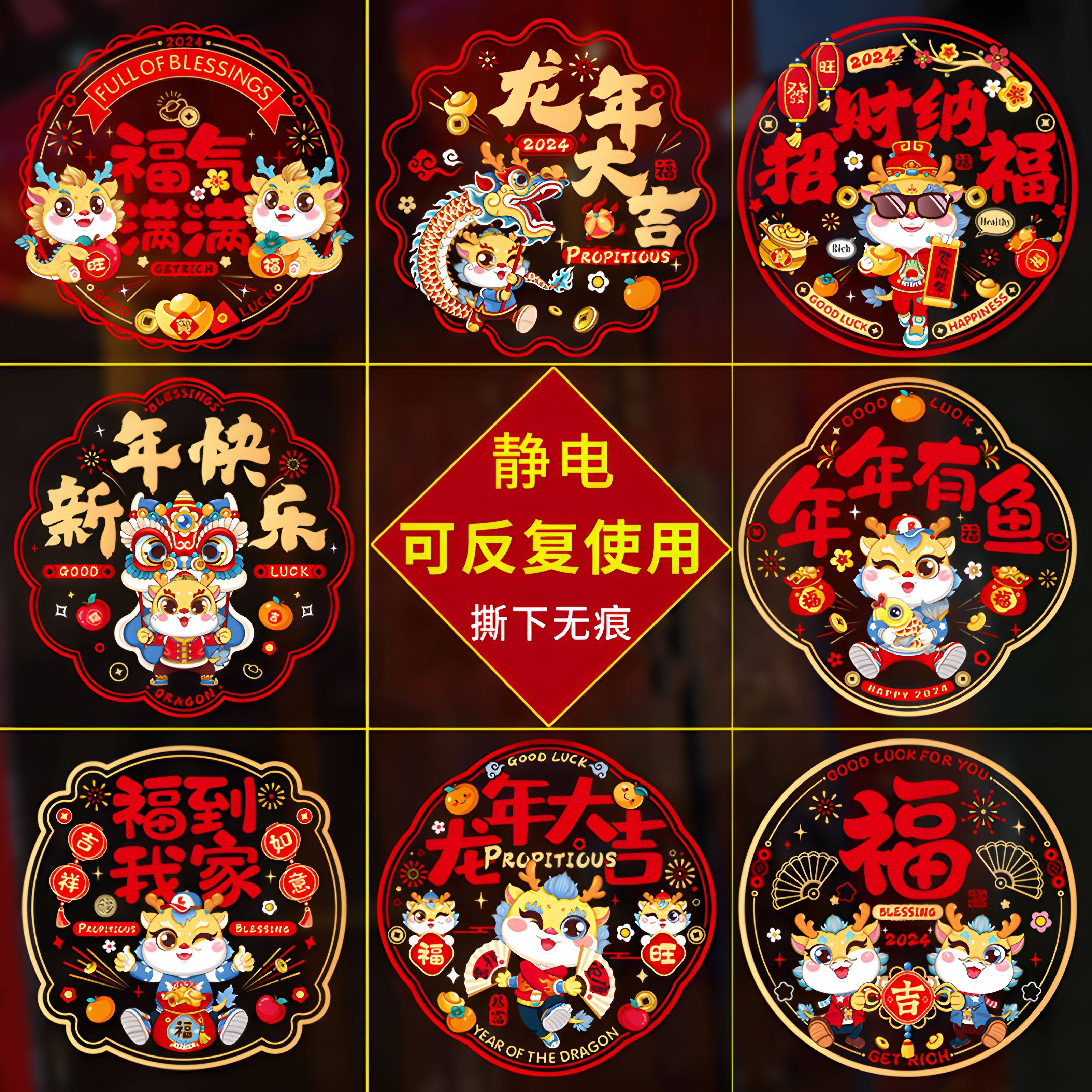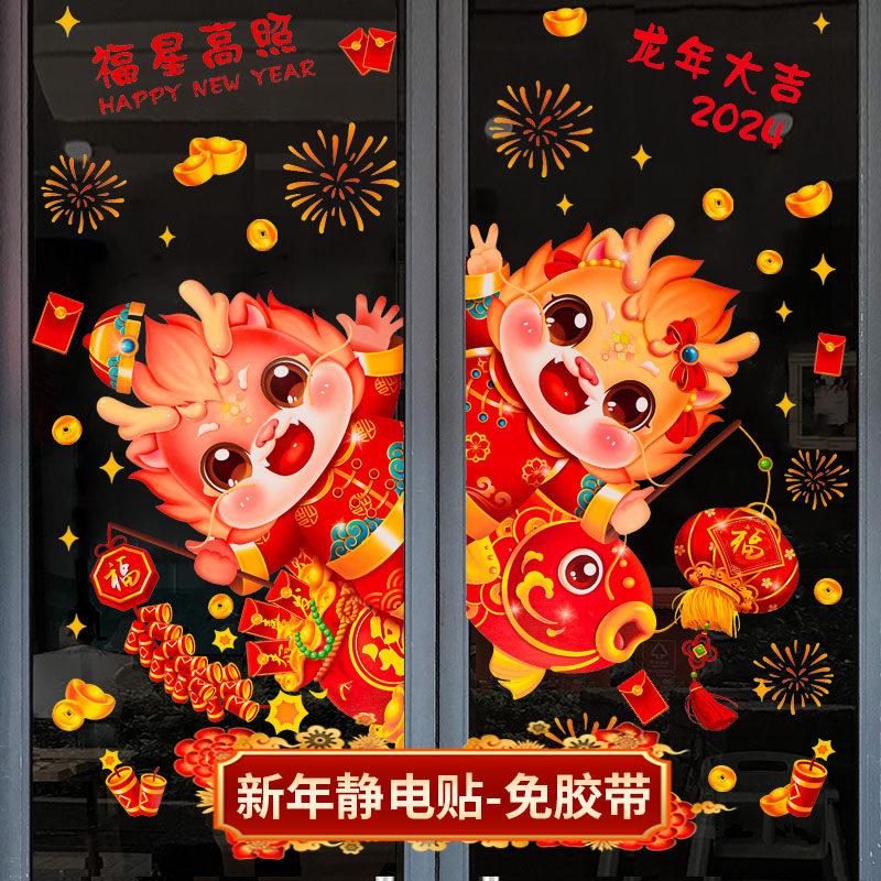 2024春节橱窗新年静电贴龙年窗花贴福字门贴画玻璃贴过年装饰布置
