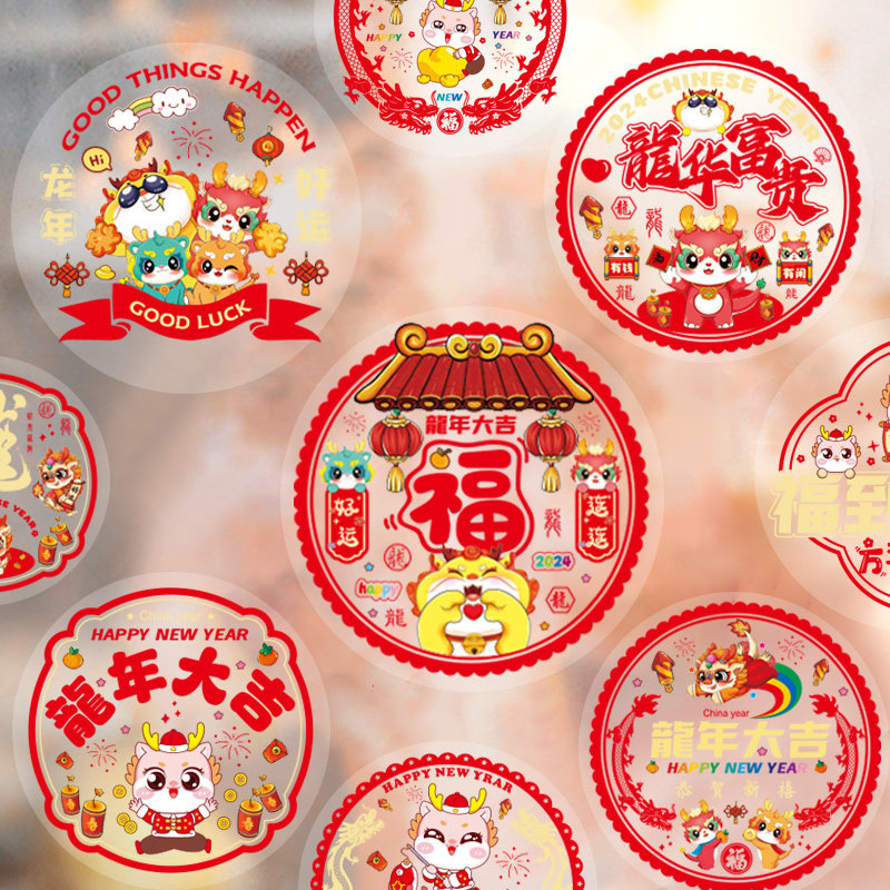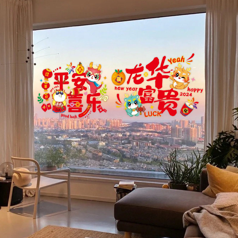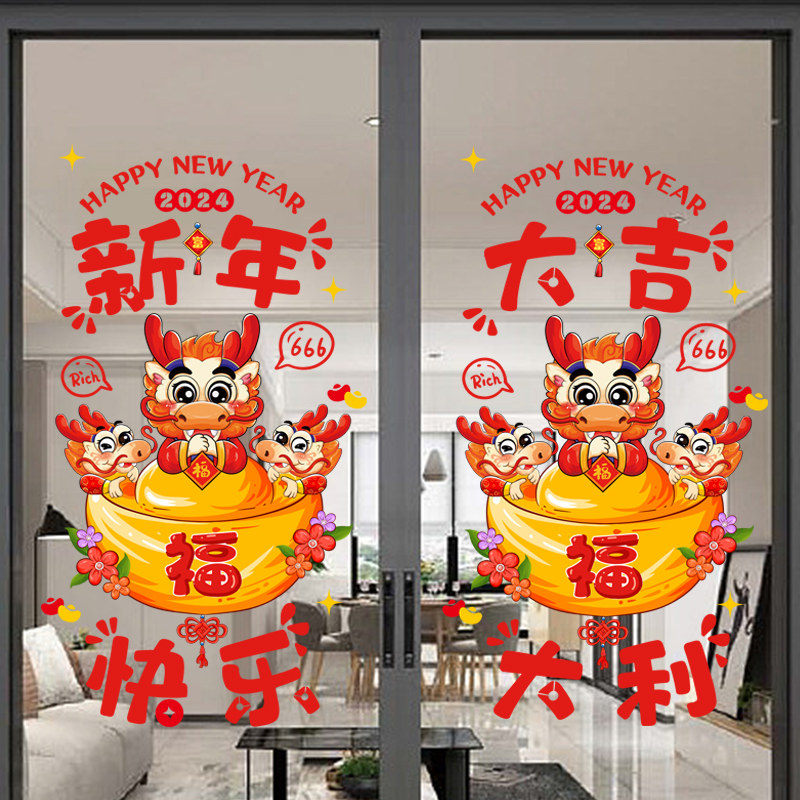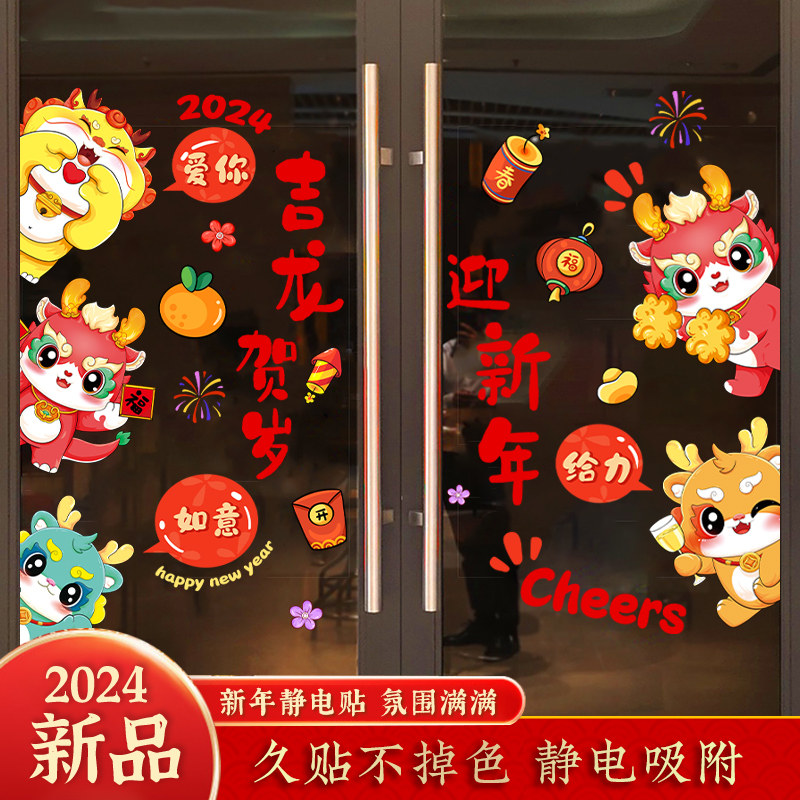 2024龙年新年春节装饰静电贴窗贴玻璃门贴纸窗花贴画元旦过年布置