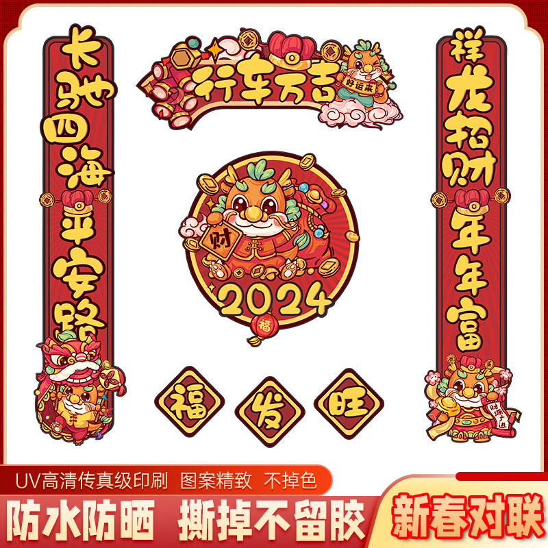 2024新年龙年汽车贴纸大吉春节对联电动车贴后档玻璃门福字电脑贴