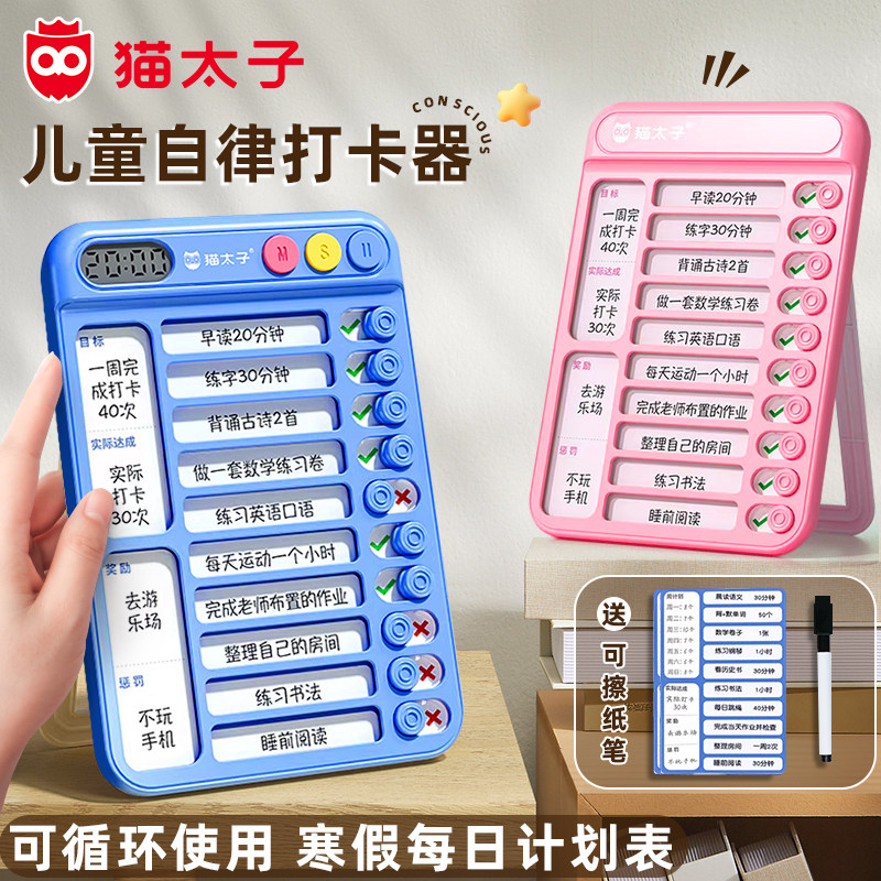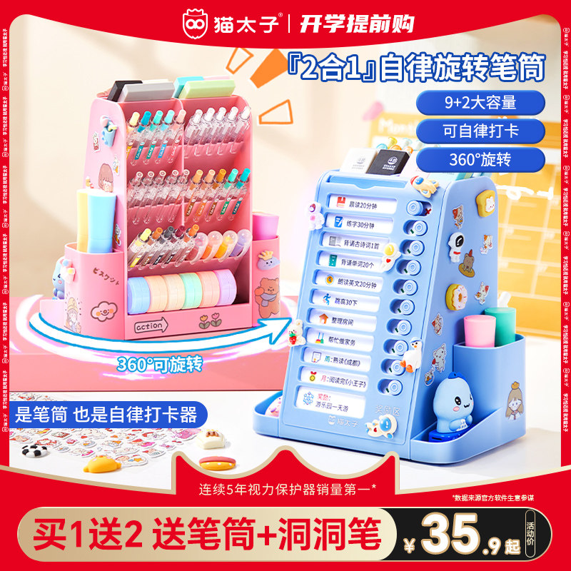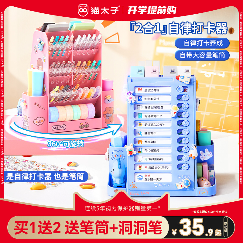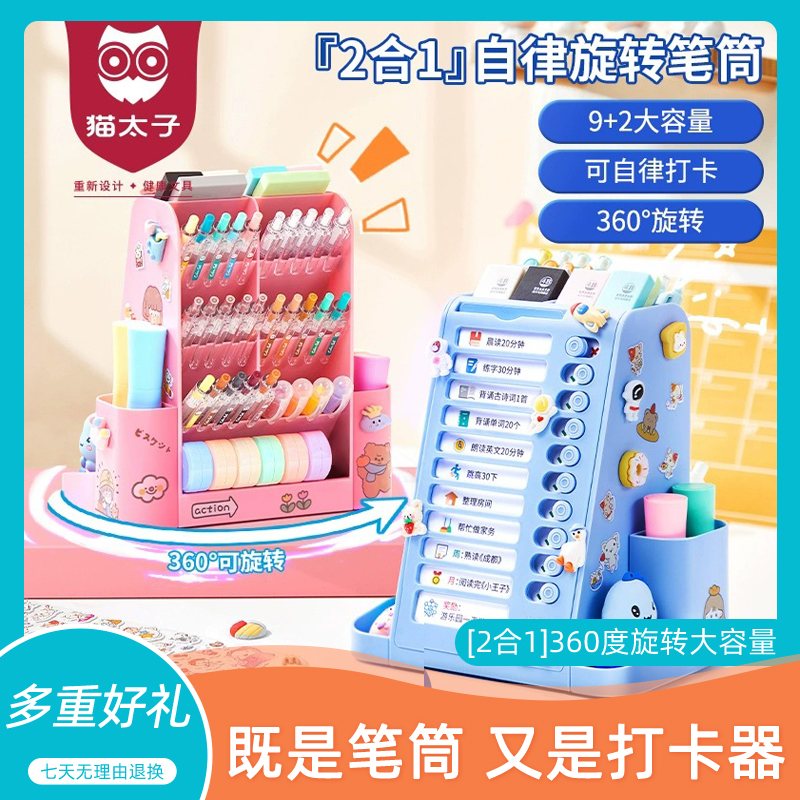 猫太子多功能自律打卡器小学生打卡记录计划表每日学习计划本安排表书桌旋转笔筒文具用品习惯养成时间管理器