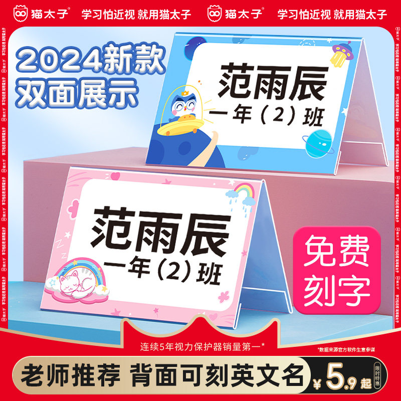 猫太子一年级姓名牌桌牌定制小学生姓名卡入学新生名字牌三角座位牌桌面台卡双面展示牌会议席卡儿童文具用品