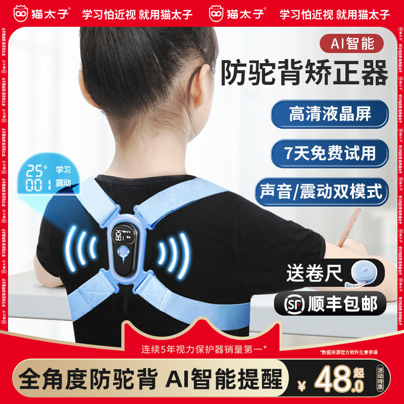 猫太子防驼背矫正器儿童小孩写字作业坐直学习防低头神器小学生隐形背部视力保护器防近视纠正姿势坐姿提醒器