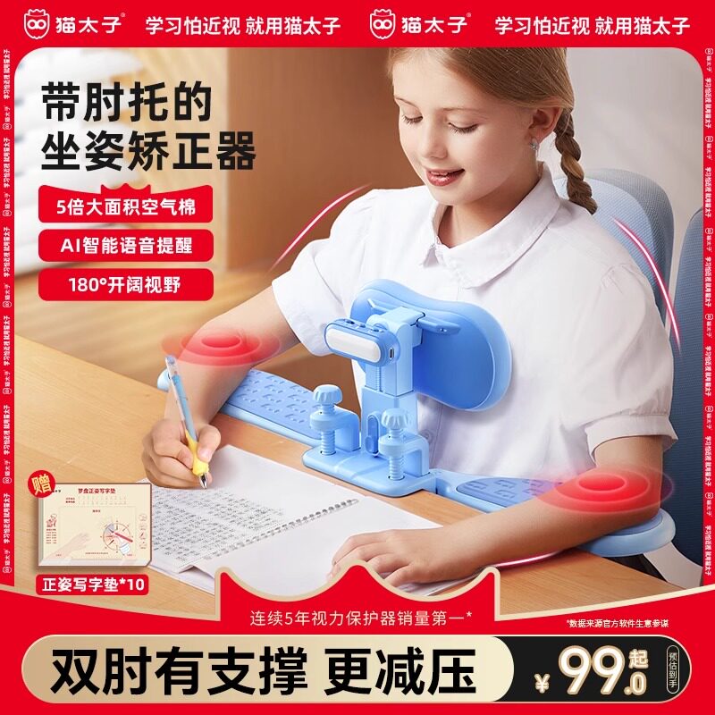 猫太子坐姿矫正器奶油皮儿童防近视写作业小学生带肘托护臂纠正器防驼背语音提醒姿势视力保护书写防低头支架