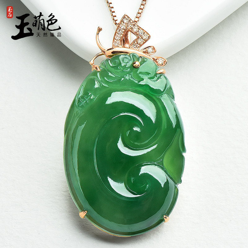 玉萌色碧玉吊坠女和田玉菠菜绿玉如意挂坠18K玫瑰金镶玉坠Z5468LY