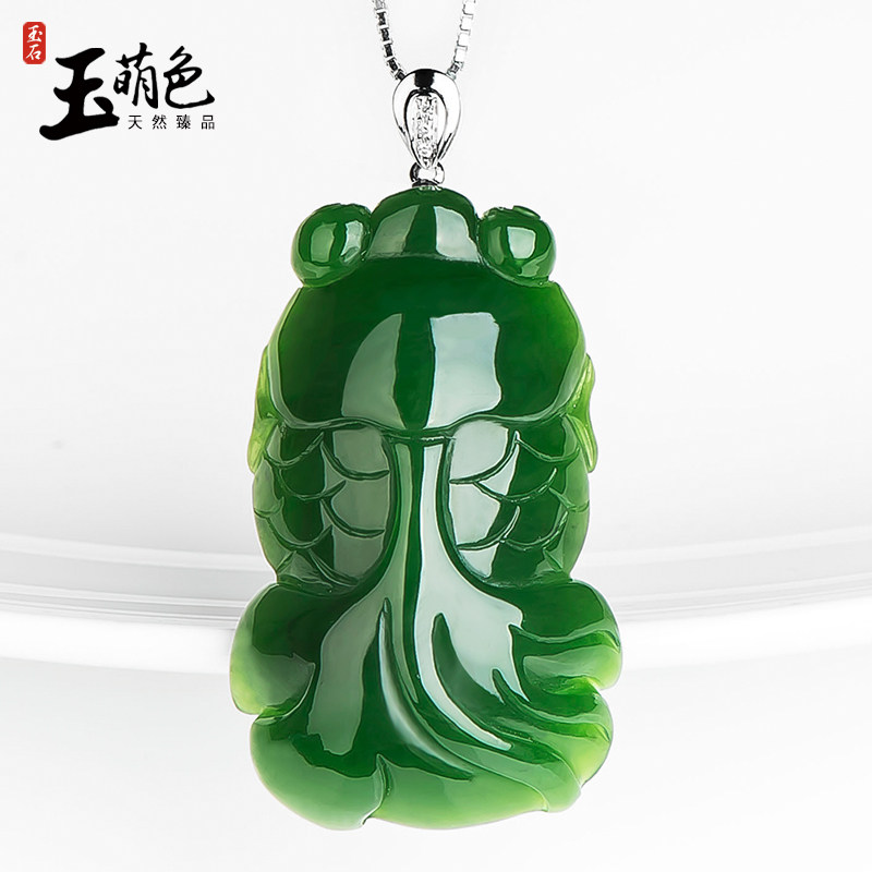 玉萌色和田玉碧玉吊坠年年有余玉坠正品玉石挂件白18K金扣692