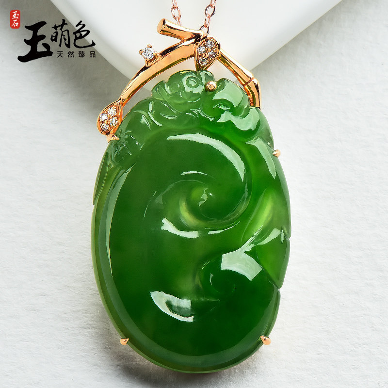 玉萌色18k金镶钻和田玉如意吊坠女菠菜绿碧玉挂件玉坠KDZ5441
