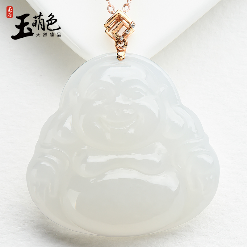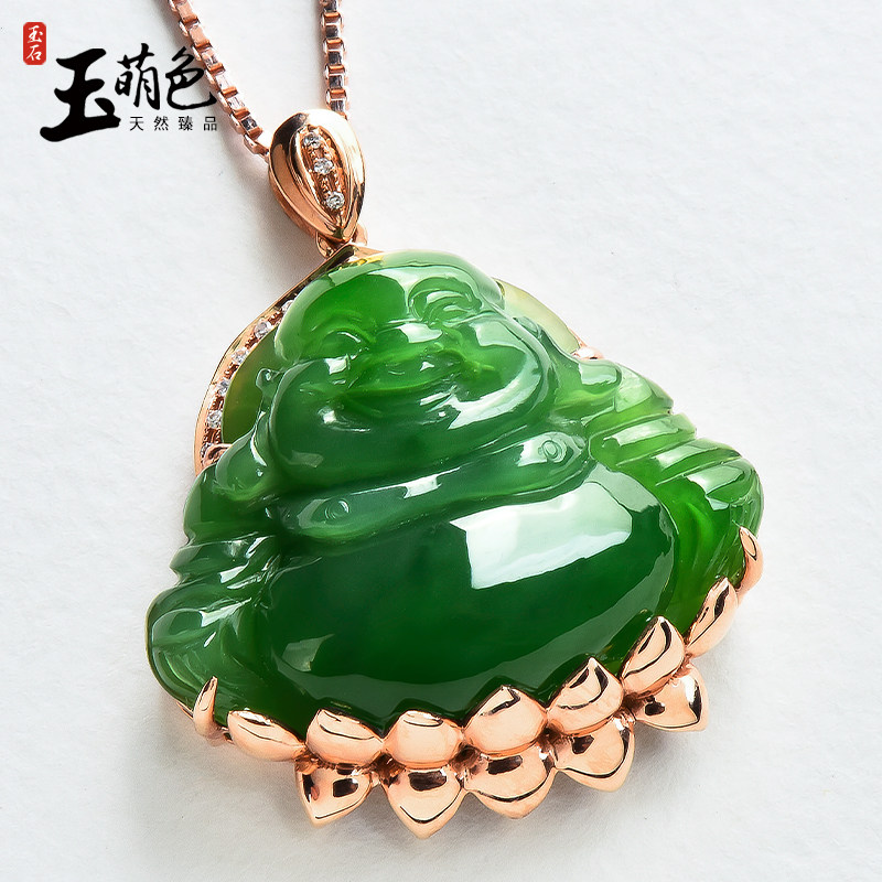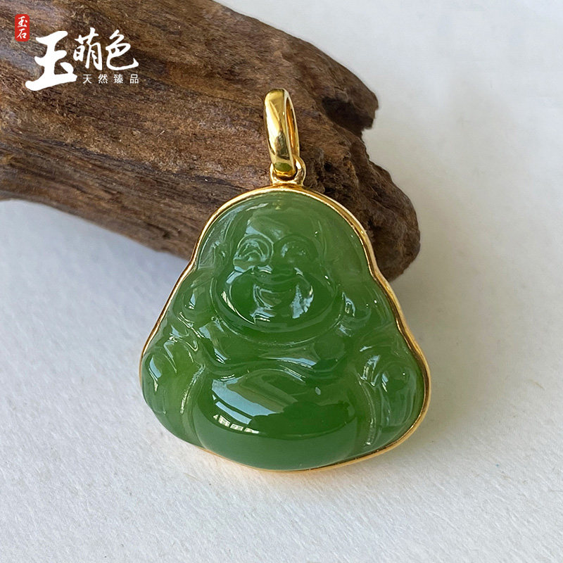 玉萌色18K金镶玉碧玉佛公吊坠和田玉笑佛玉佛挂件正品玉石096