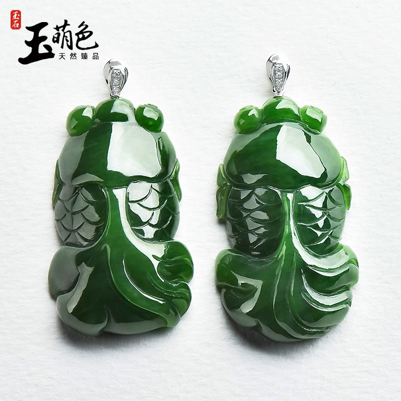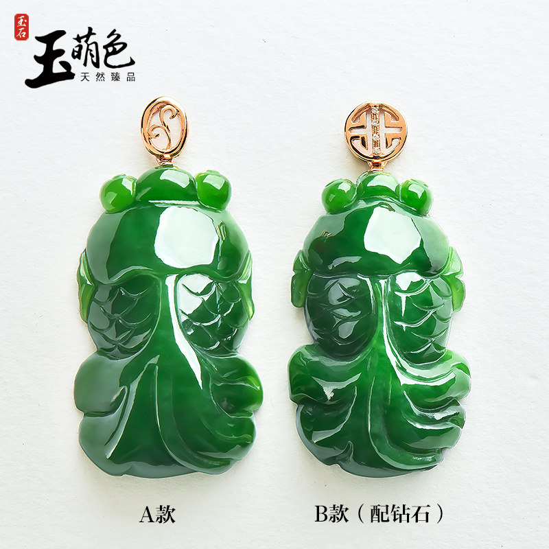 玉萌色18k金镶嵌钻石 正品和田玉年年有余挂件 碧玉吊坠 带证书