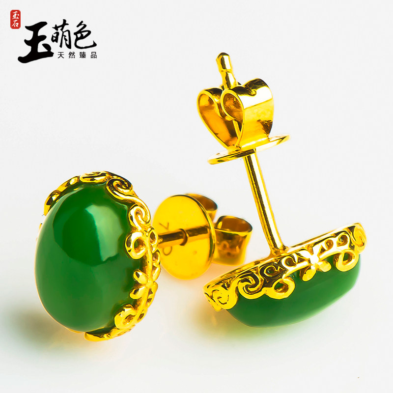 玉萌色18k金镶玉和田玉碧玉耳钉女玉石耳环耳坠耳饰带证书Z1433