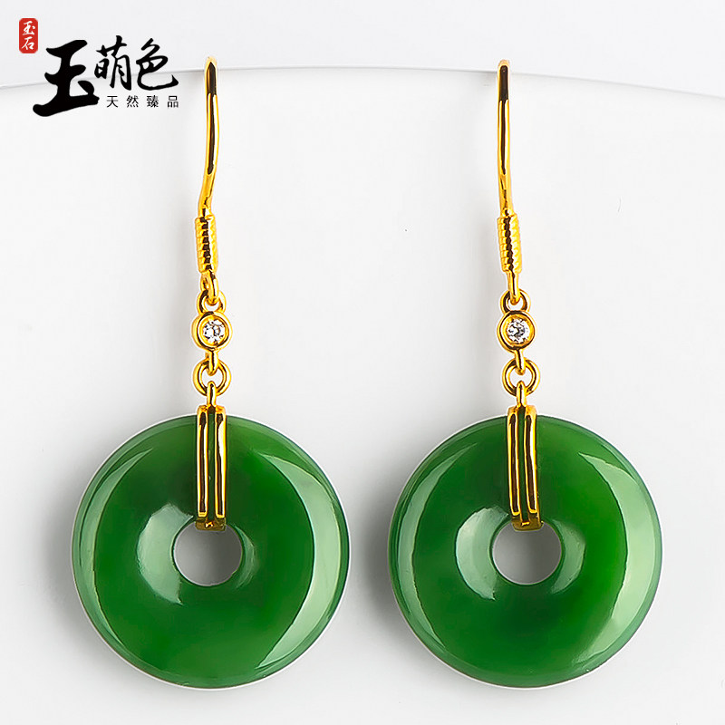 玉萌色18k金镶嵌钻石 和田玉耳坠耳饰碧玉耳环平安扣带证书KDZ827