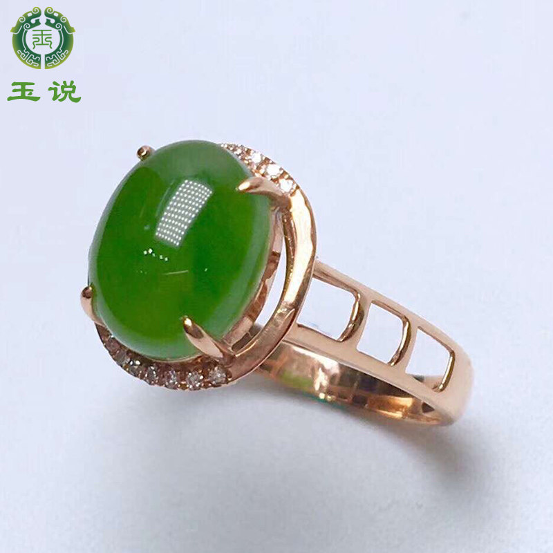 和田玉碧玉戒指女款18K金镶玉戒指环玉石手饰品12*16MM附证书KJ