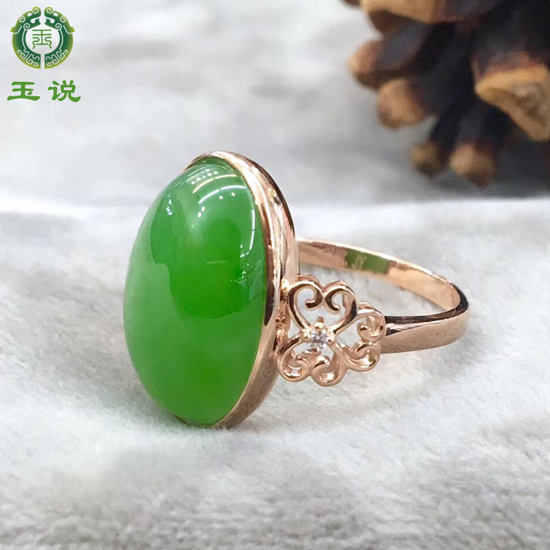 玉说和田玉碧玉戒指女款K金镶嵌阳绿圆珠富贵简约玉石手饰附证书