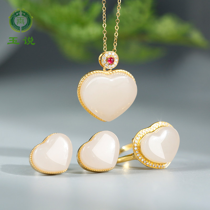 玉说和田玉18K金镶爱心套装女款吊坠玉坠耳钉藕粉玉戒指玉石挂件