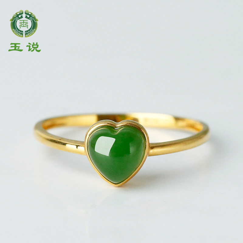 玉说和田玉戒指女款K金镶嵌碧玉爱心玉石富贵手饰内径17mm附证书