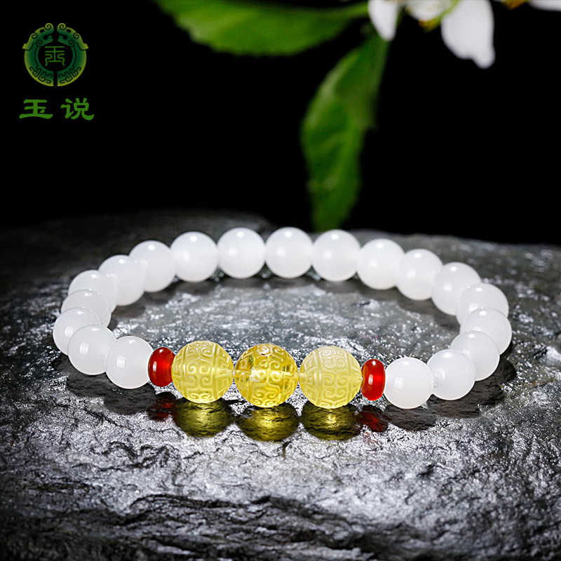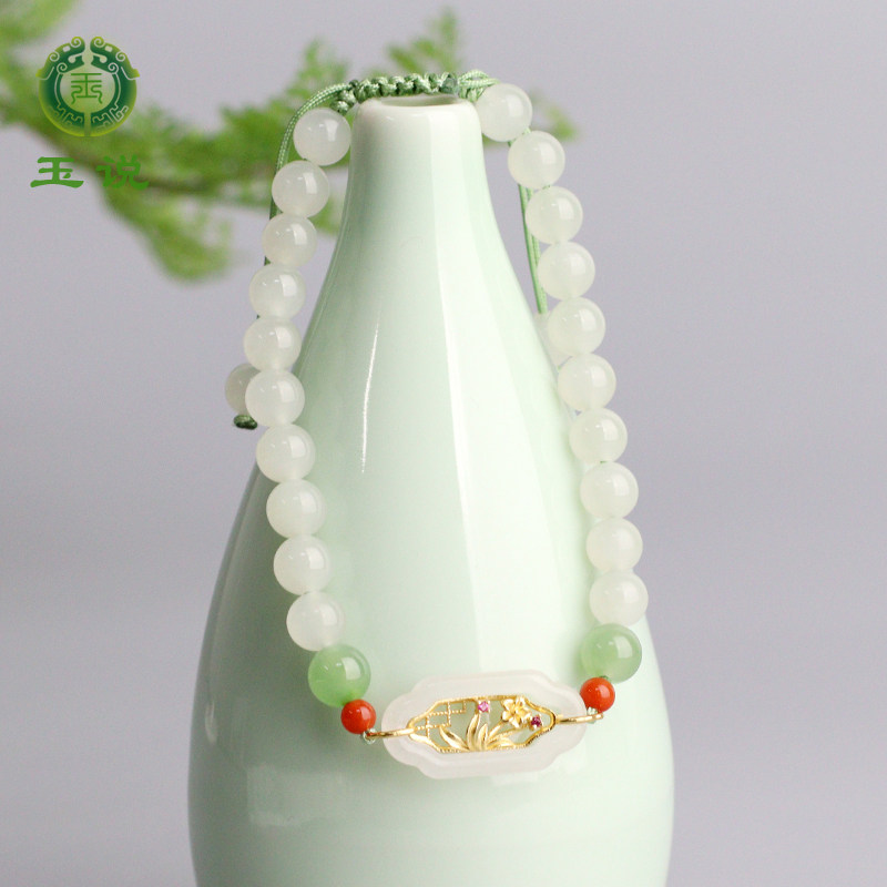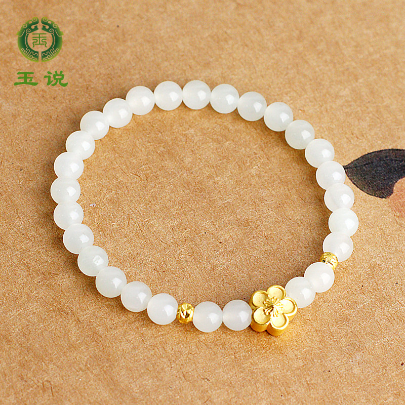 玉说和田玉白玉手串女款玉石玉器圆珠手链足金珠玉手链附证书