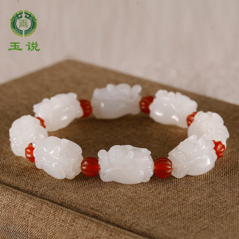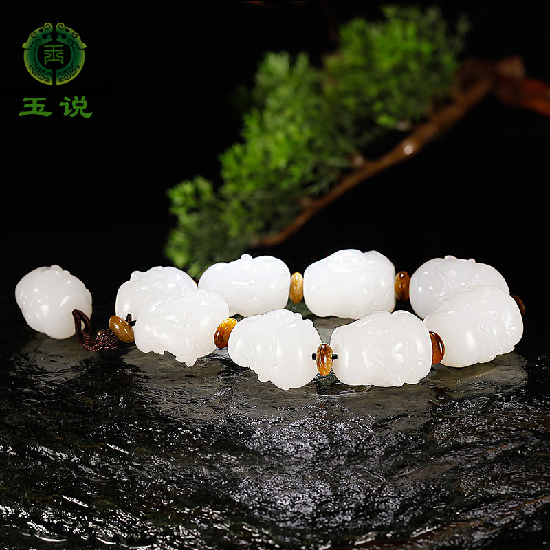 玉说和田玉羊脂白玉貔貅手串男女款手饰玉石立体兽头玉手链附证书