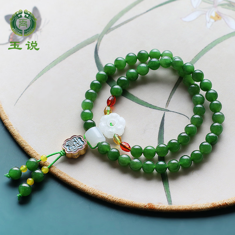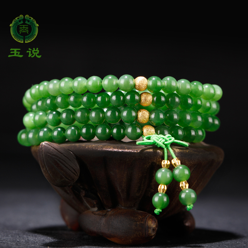 玉说和田玉碧玉手串女款玉石圆珠配足金珠多圈手链送女友礼物手串