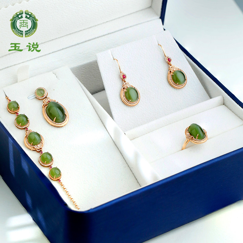 玉说和田玉碧玉套装吊坠女款猫眼18k金豪镶蛋面玉石挂件手链戒指