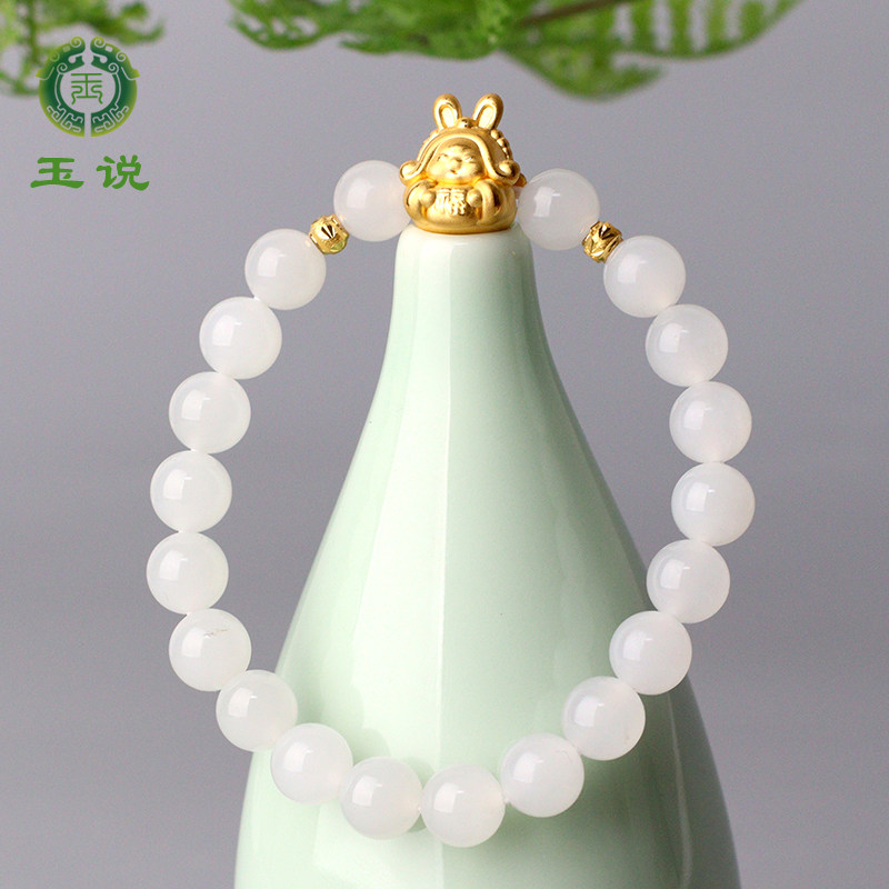 玉说和田玉羊脂白玉手链女款足金兔子玉石圆珠手串圆满富贵附证书