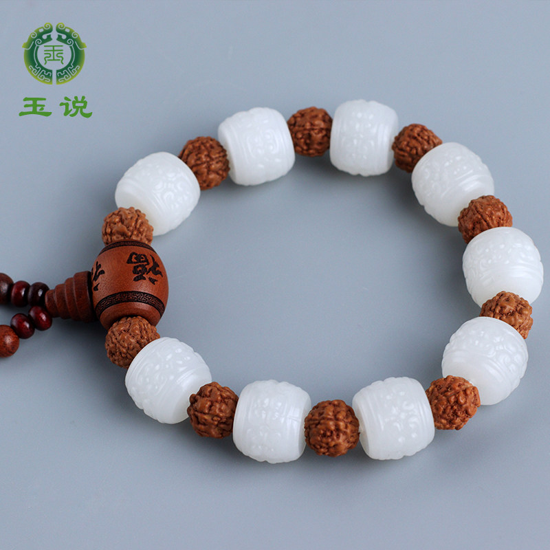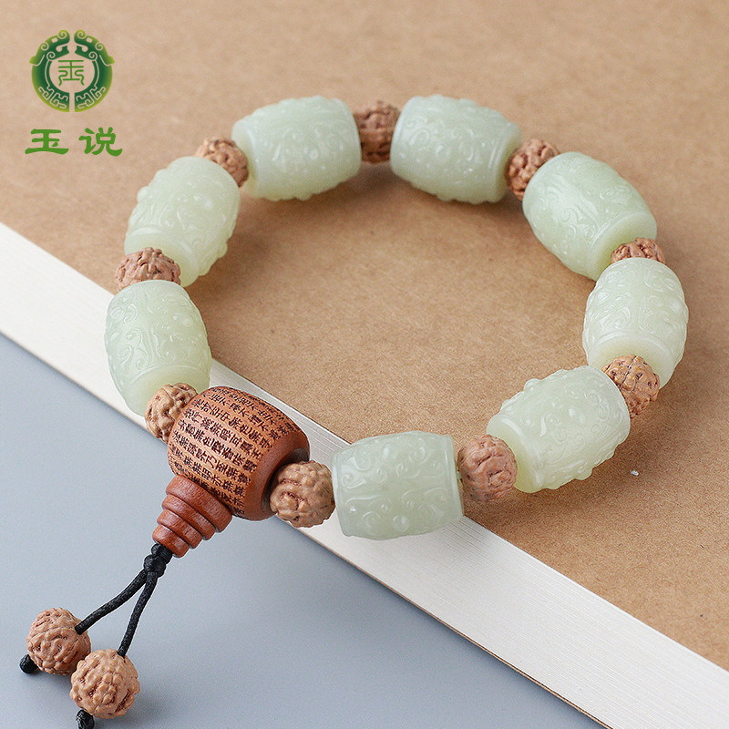 玉说和田玉羊脂白玉仿古纹手链男款玉石手串桶珠玉器手饰附证书