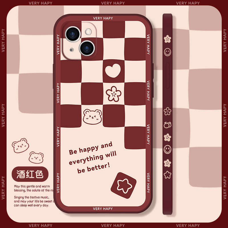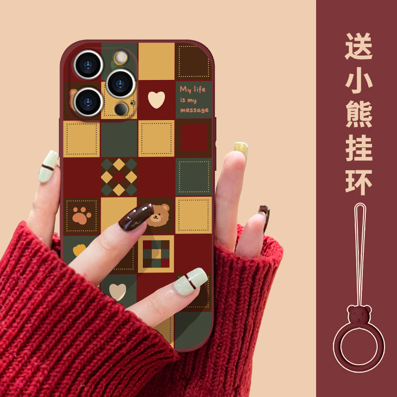 适用于苹果13手机壳ip12直边液态硅胶iphone11可爱侧边爱疯8秋冬酒红IP7格子小熊x/xs/xr/xsmax情侣6s保护套