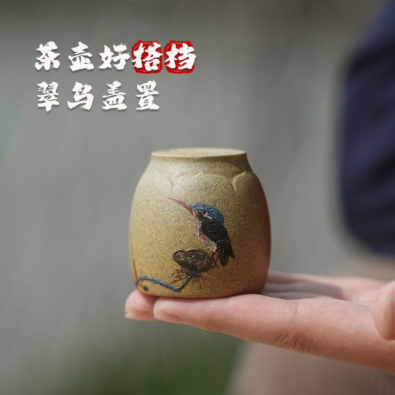 【畅陶】宜兴原矿紫砂创意茶道茶具盖托柴烧泥绘翠鸟茶宠茶玩盖置