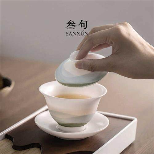 叁旬冰种玉瓷高档茶具套装家用客厅轻奢泡茶陶瓷盖碗功夫茶杯茶盘