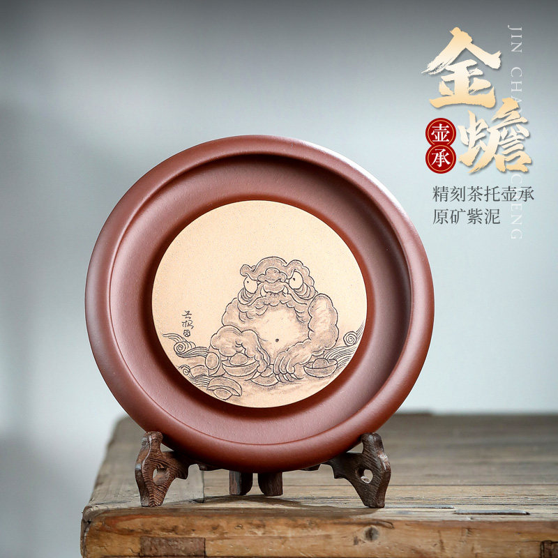 【畅陶】宜兴紫砂壶壶承干泡台小茶盘茶道配件紫泥刻绘金蟾茶托