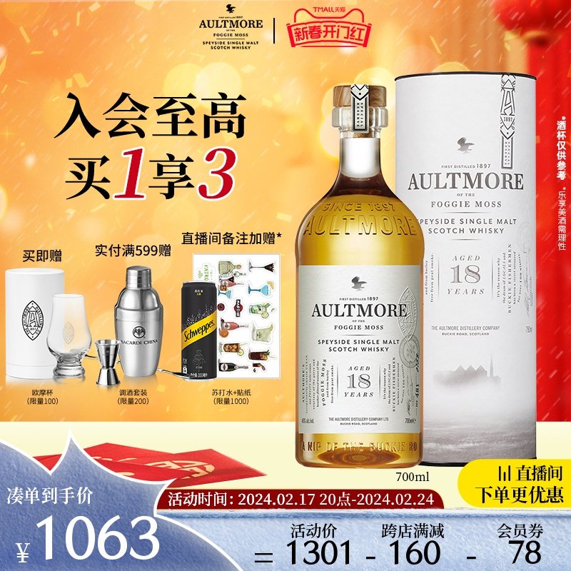 【官方直营】 AULTMORE欧摩18年洋酒斯贝塞单一麦芽威士忌700ml