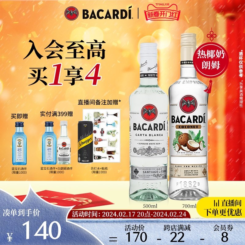 【官方直营】 百加得白朗姆500ml+椰子风味朗姆酒700ml调酒基酒