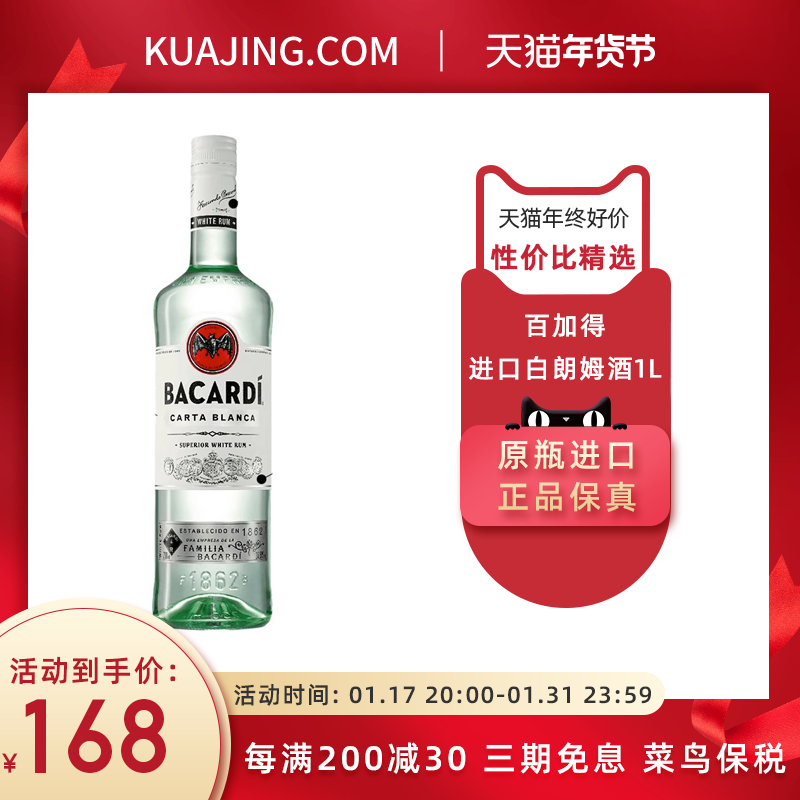 英国百加得Bacardi白朗姆酒烘焙调酒原瓶进口基酒1000ml莫吉托