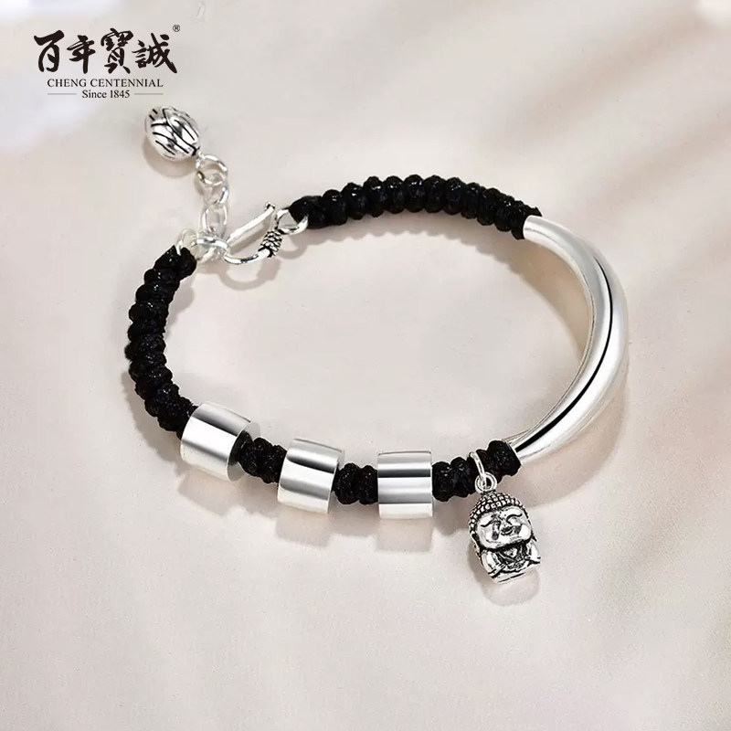 百年宝诚足银手串阿弥陀佛手链手工编织黑绳复古国潮银手环可调节