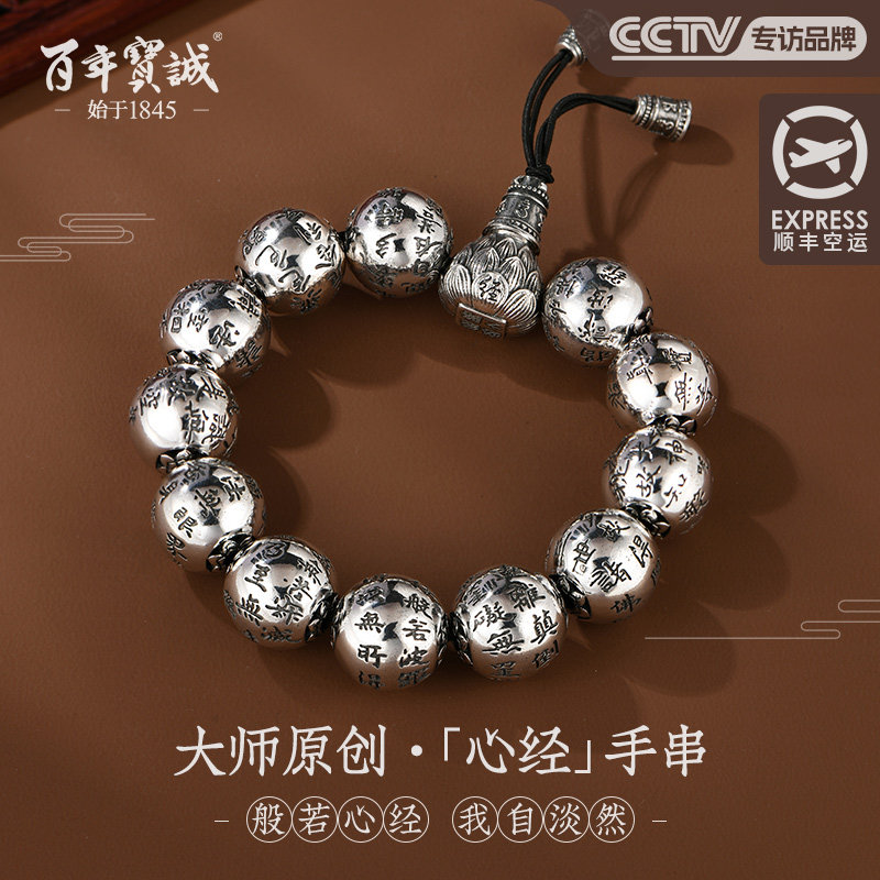 心经银手串925纯银男女同款银佛珠手串空心文玩复古银饰念佛手链