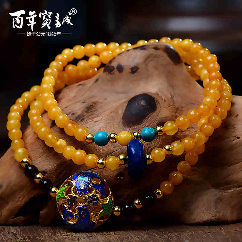 百年宝诚琥珀蜜蜡手串108颗鸡油黄佛珠女青金石绿松石银手链