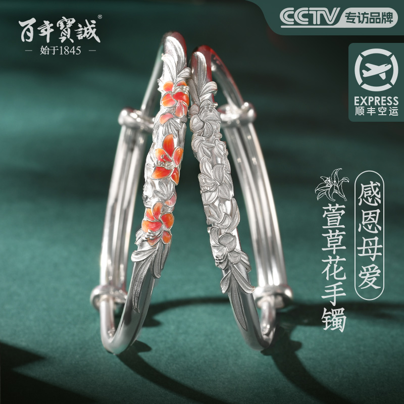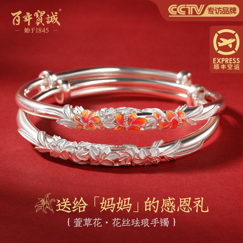 繁花银手镯女999纯银萱草花送妈妈景泰蓝实心银镯子母亲生日礼物