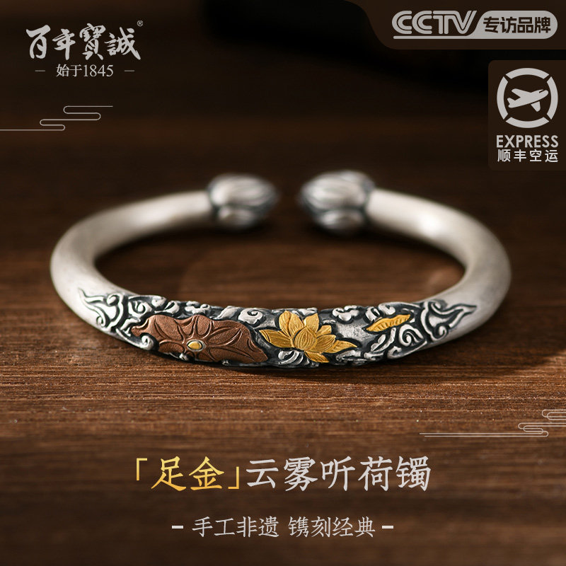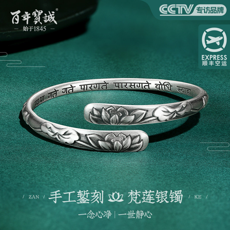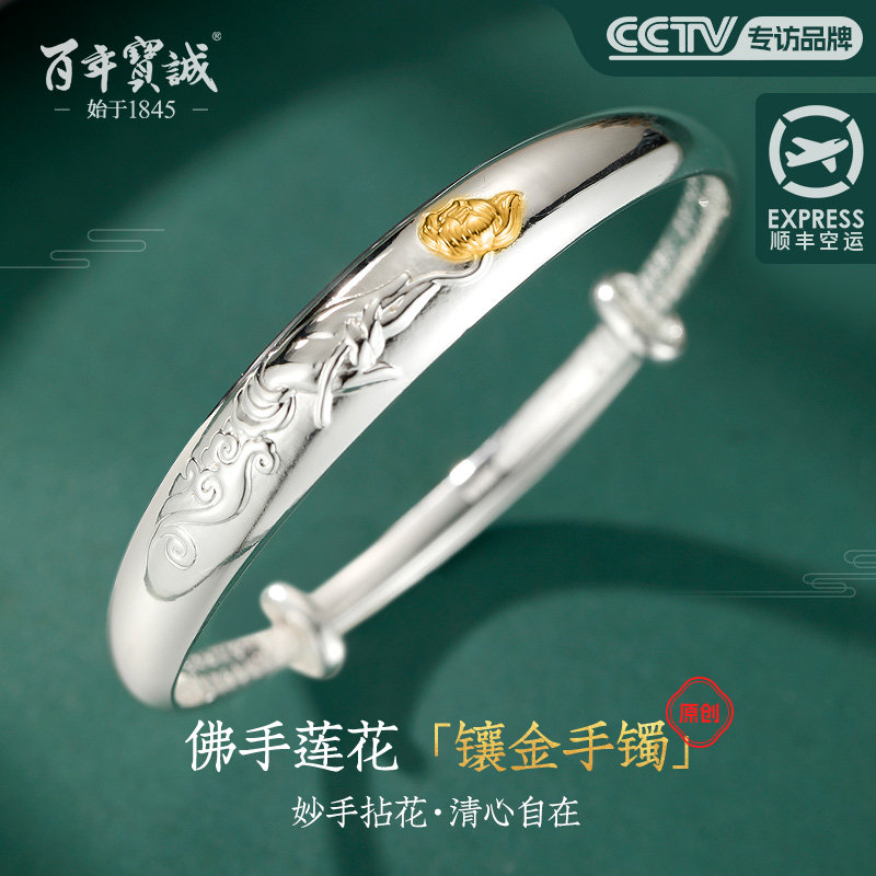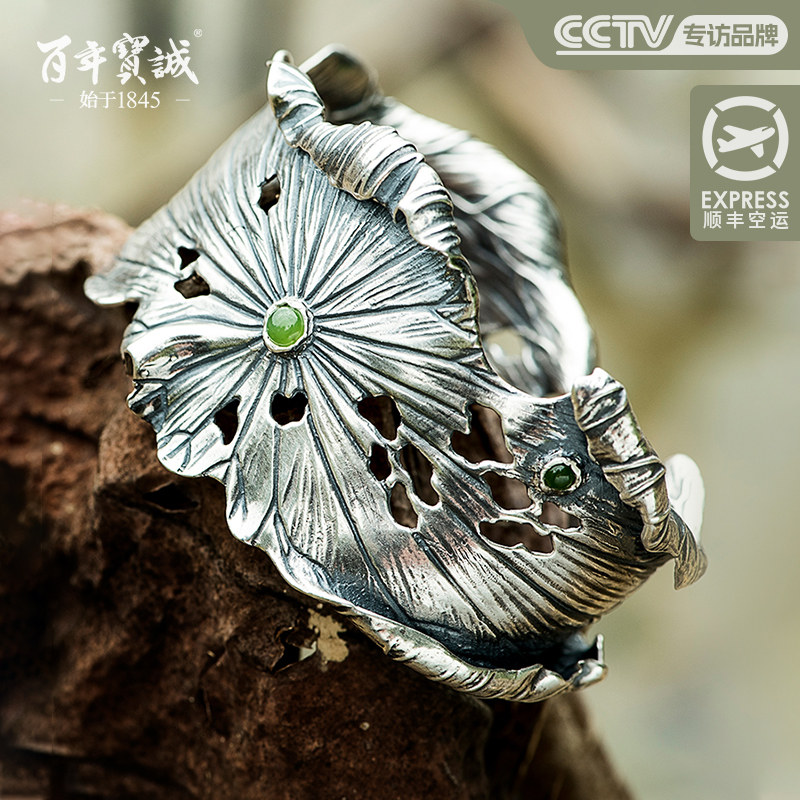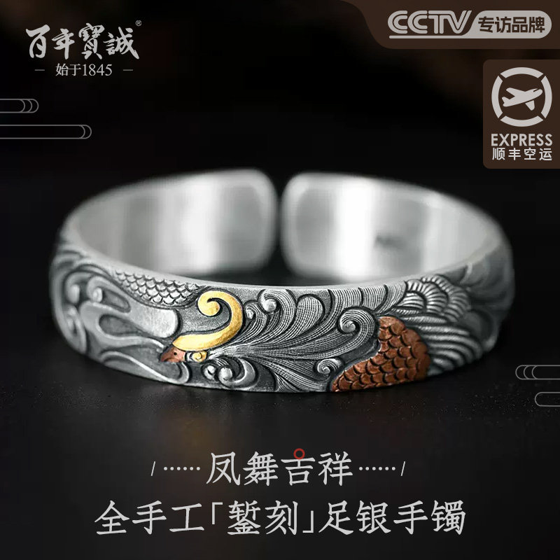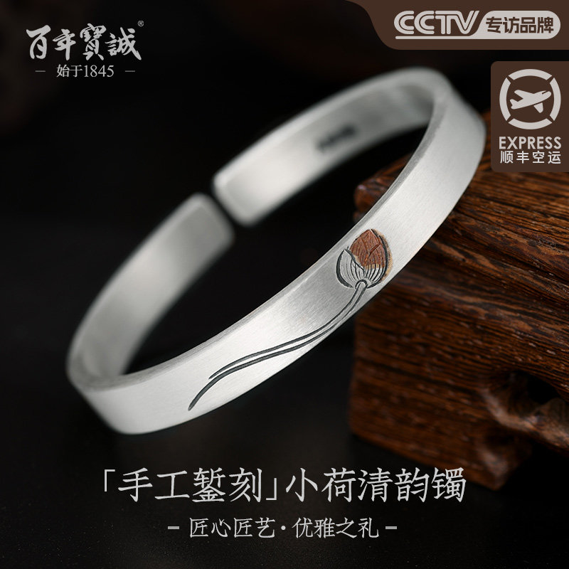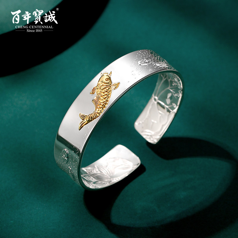 百年宝诚浮雕银手镯女纯银鱼戏莲花足银镯子宽版实心开口送妈妈