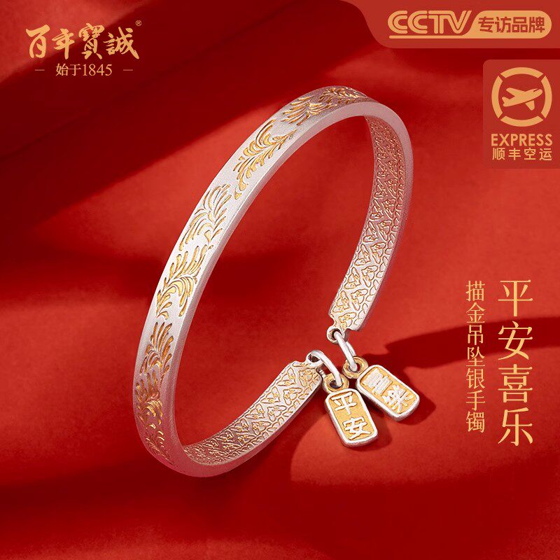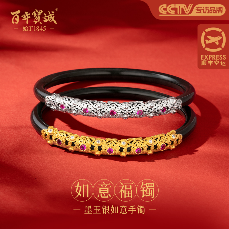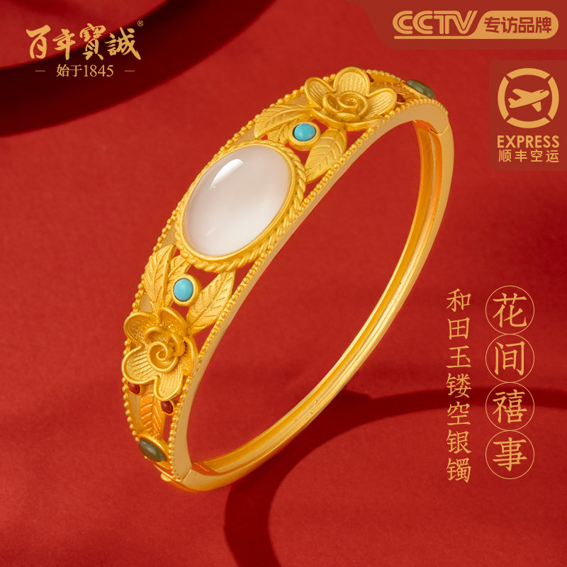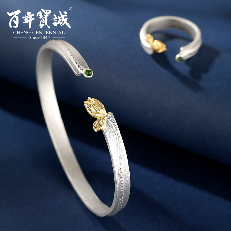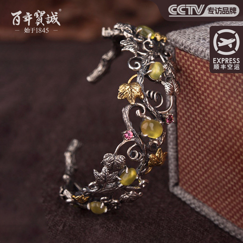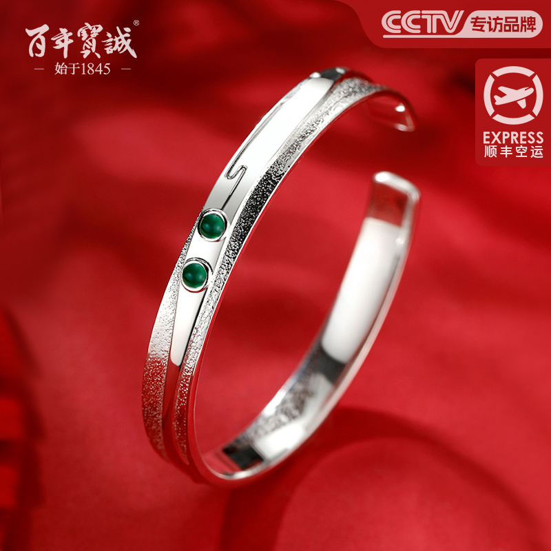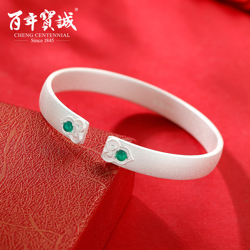 百年宝诚纯银镶玉髓流淌岁月银手镯女纯银国风简约开口磨砂银镯子