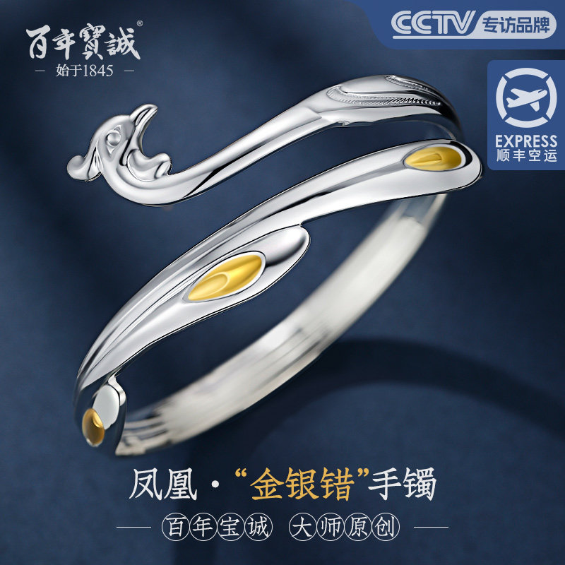 凤凰纯银手镯女非遗金银错999纯银镶24K金国潮年轻款银手环送女友