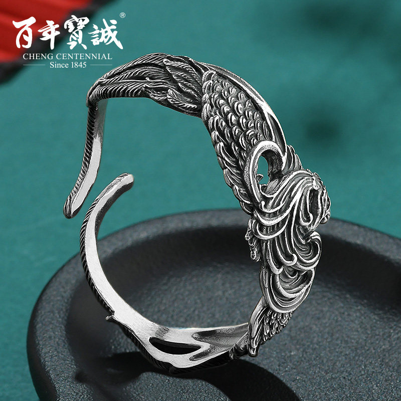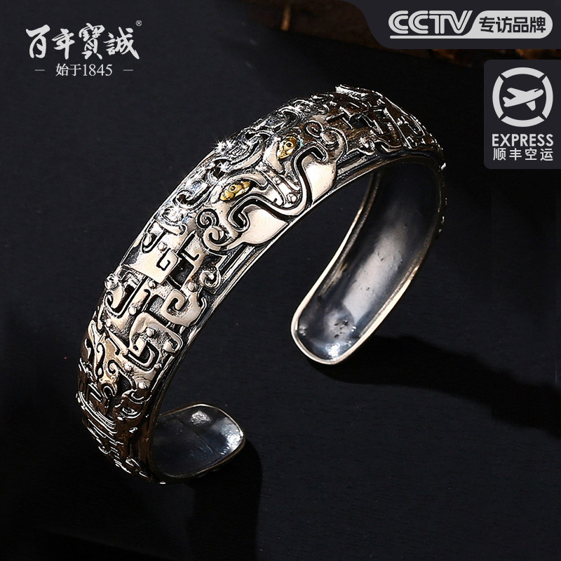 百年宝诚925饕餮银手镯男士藏银复古做旧民族风开口银手环送男友