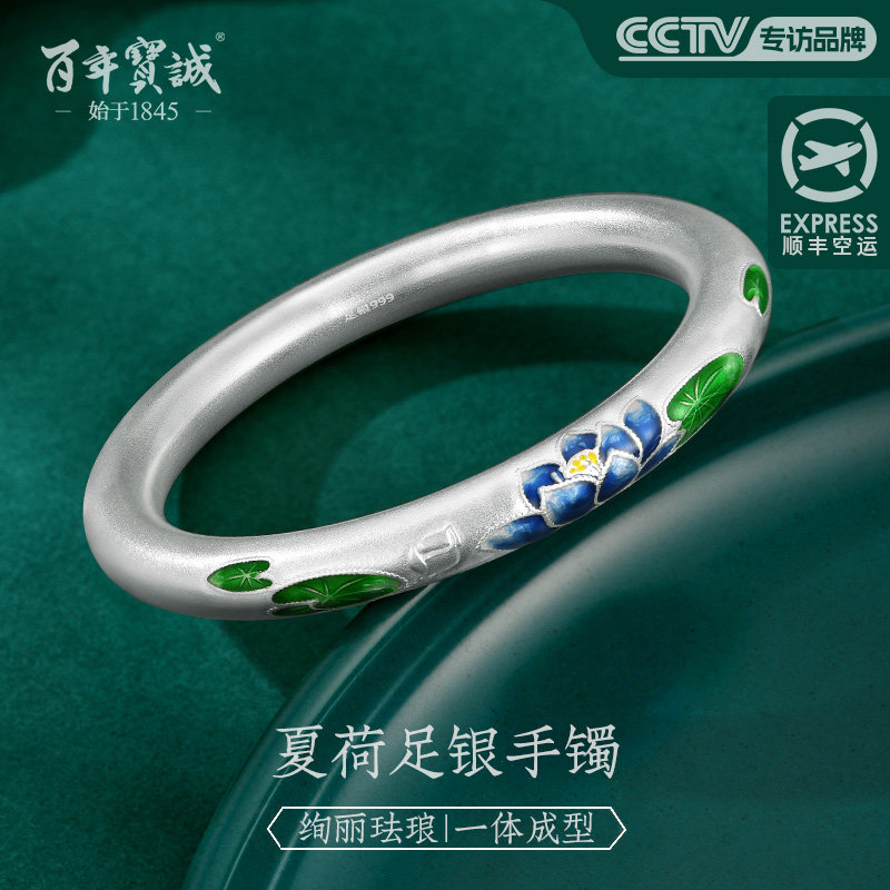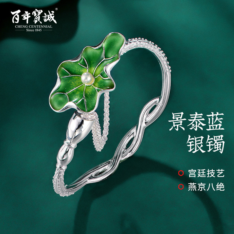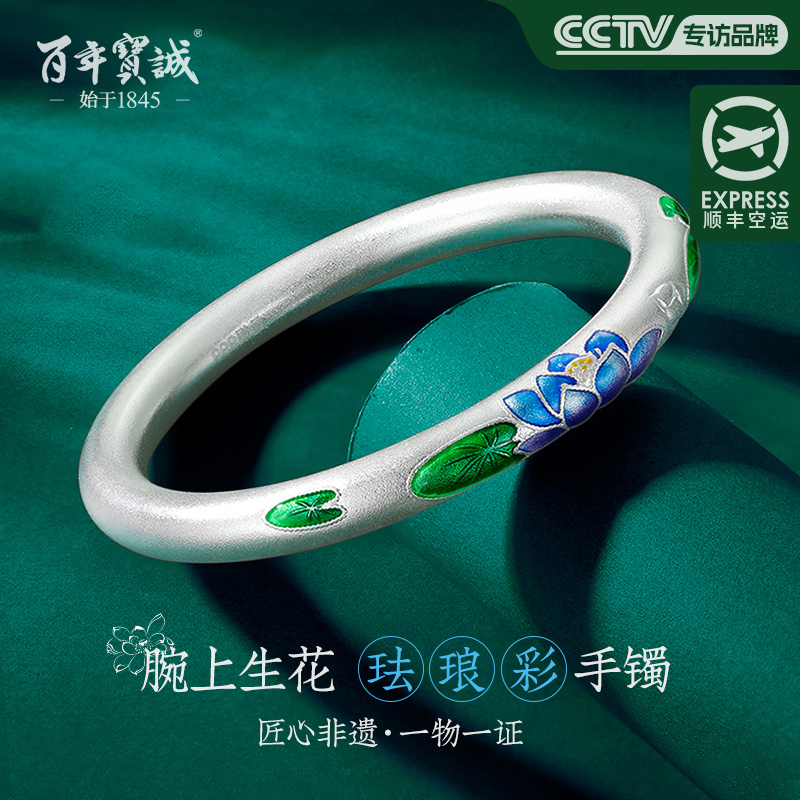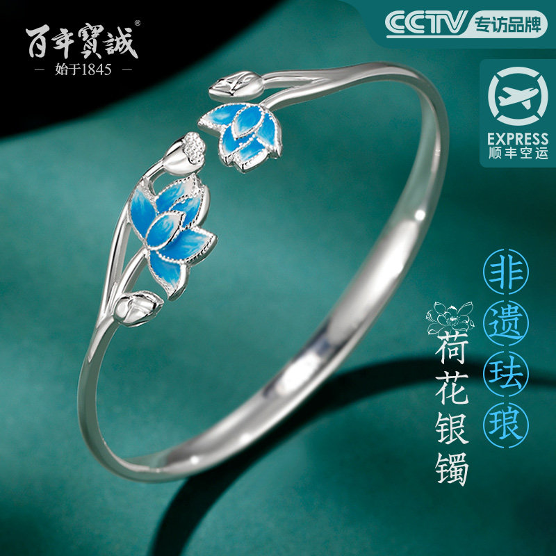 景泰蓝手镯珐琅手镯纯银莲花手镯年轻荷花银镯子三八节礼物送女友